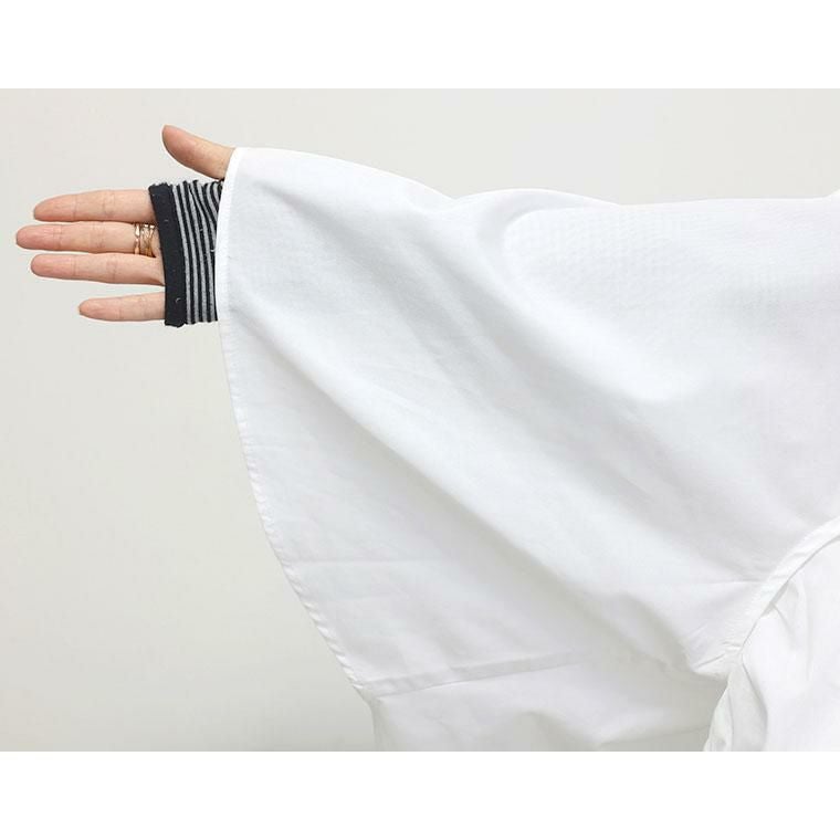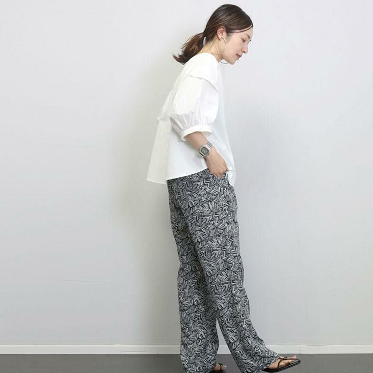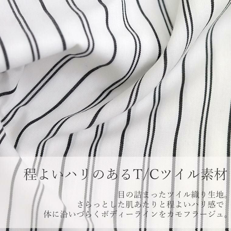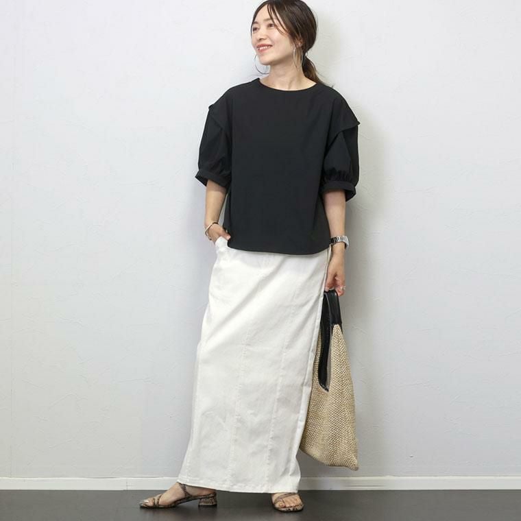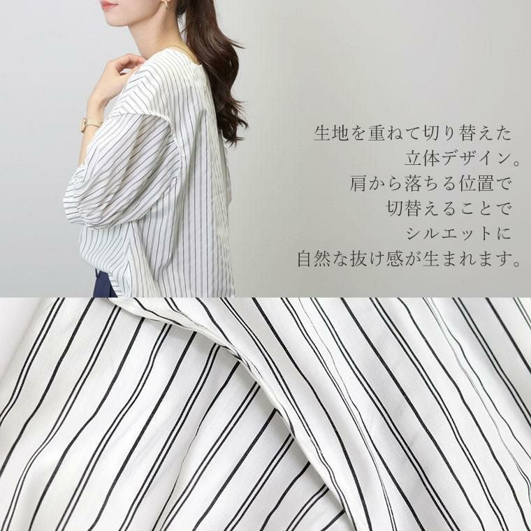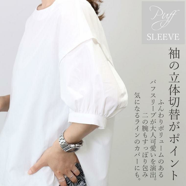 ぽわんとしたパフスリーブが特徴のプルオンブラウス。気になる二の腕の悩みをすっぽり解消してくれる大人の女性に嬉しいデザインです。立体的な袖の切替が旬なポイントになっています。生地はさらり軽い着心地のT/Cツイル素材。薄手ながらも程よいハリが体のラインに沿いづらく、ボディーラインをカモフラージュしてくれます。緩やかなフレアシルエットとなだらかに弧を描く裾のラインが優しい印象。ボトムにさっと重ねるだけでバランスが良い絶妙な丈感です。ベーシックな無地のモノトーンと、凛としたストライプ柄のコーデしやすいカラー展開も魅力です。