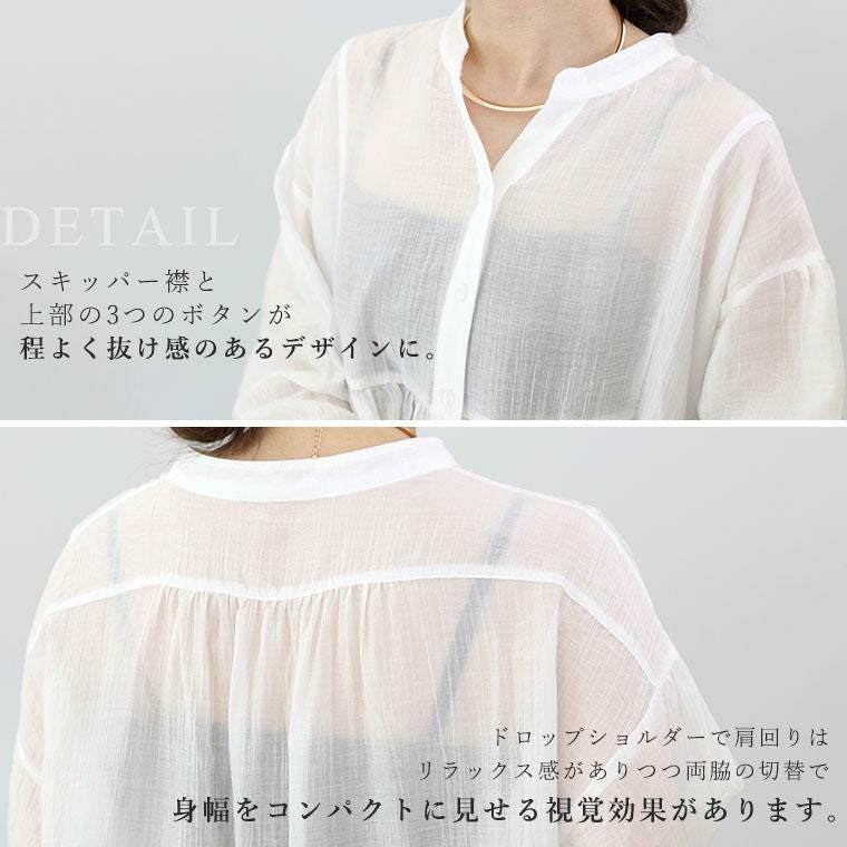 着丈はヒップから7cm下。袖丈は手首から11cm下。透け感のある素材で軽く涼しく着れます。ヒップをカバーしてくれる着丈で◎。ボタンは胸下までしか付いていません。