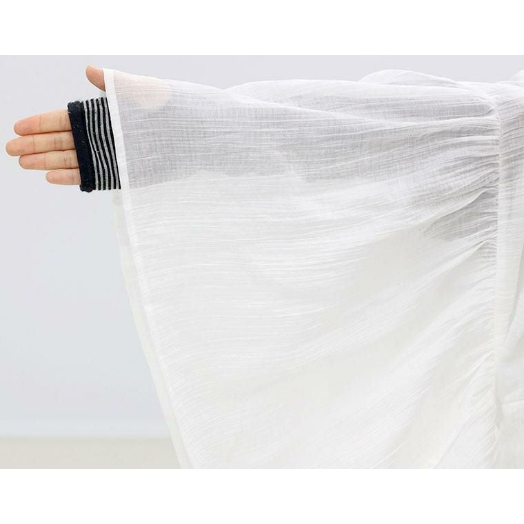 着丈はヒップが丁度隠れるくらい。袖丈は手首から10cm下。軽くてゆったりしたサイズ感で窮屈感はありません。かなり薄手で軽い着心地です。透け感がしっかりありますが長い季節使えるアイテムだと思います。