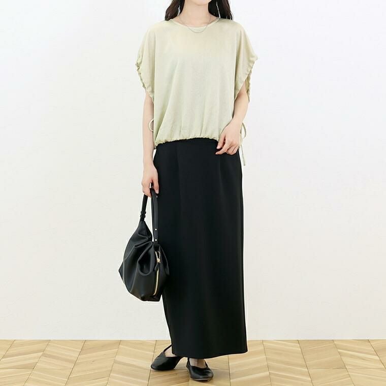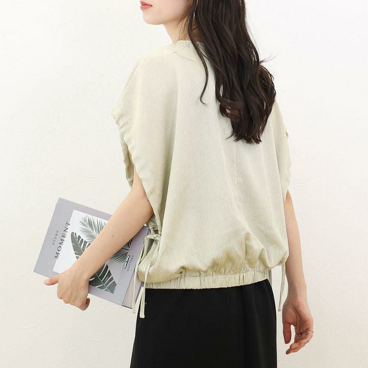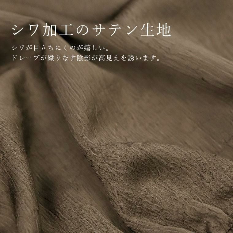 シワ加工なシボ感があるサテン生地で、シワが目立ちにくいのが嬉しい。ドレープが織りなす陰影が高見えを誘います。ボックスシルエットで身体のラインを拾わず、リラクシーなのにきちんと見え、体型カバーしつつ抜け感ある印象に。後襟の窓あきボタンで、後ろ姿にも品のあるアクセント。袖口はドロスト仕様で、ギャザーを自在に調節可能。気分やシーンに合わせて、フォルムに変化がつけられます。共布のリボンがさりげないアクセントに。カジュアルにもフェミニンにもなじみます。全周ゴムの裾ギャザーで、自然に腰まわりのラインをカモフラージュ。腰に軽くかかる着丈で、合わせるボトムを選ばない優秀シルエット。上品な素材感とディテールの効いたデザインが存在感ある1枚です。