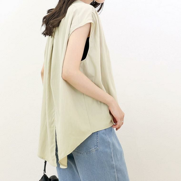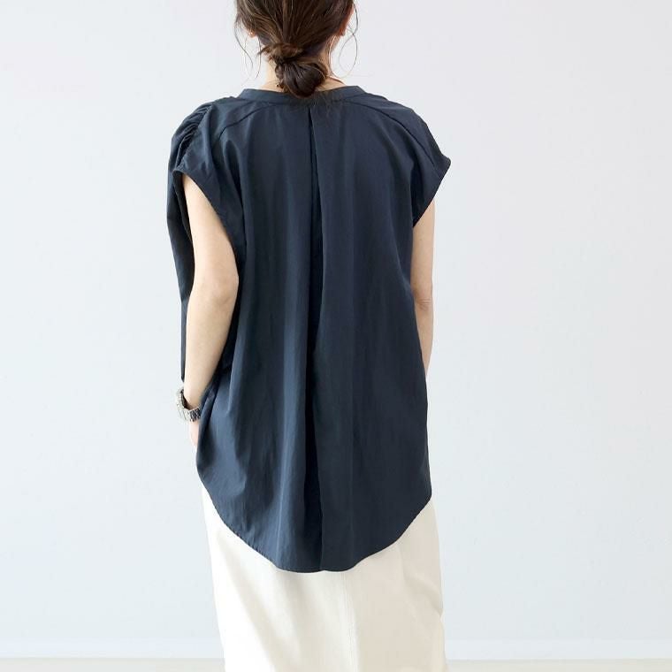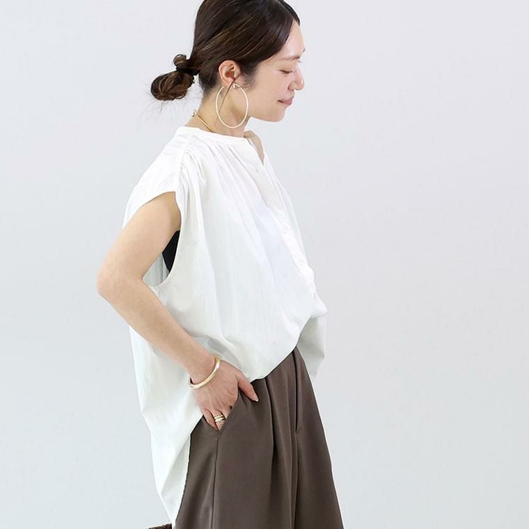 マットな光沢が落ち着いた印象を与えるブラウス。ビンテージサテンの上質な生地感が高見えを演出します。シワ加工でナチュラルな抜け感があり、着こなしにこなれた空気感をプラス。フレンチスリーブが肩先を優しく覆い、涼しさと上品さを両立。肩のラインと襟元に寄せた繊細なギャザーが、柔らかな立体感を生みます。バンドカラーで顔まわりがすっきり、美しく引き締まる印象に。ボタンの開け方で表情を変えられます。ワイドな身幅が身体のラインを拾わず、ストレスフリーな着心地。後ろ裾のスリットが、動きに合わせて軽やかな印象をプラス。後ろ襟のタックが後ろ姿にもニュアンスを加え、立体的なフォルムに抜け感と華やかさを兼ね備えた、オンオフ問わず活躍する一枚です。