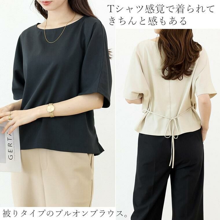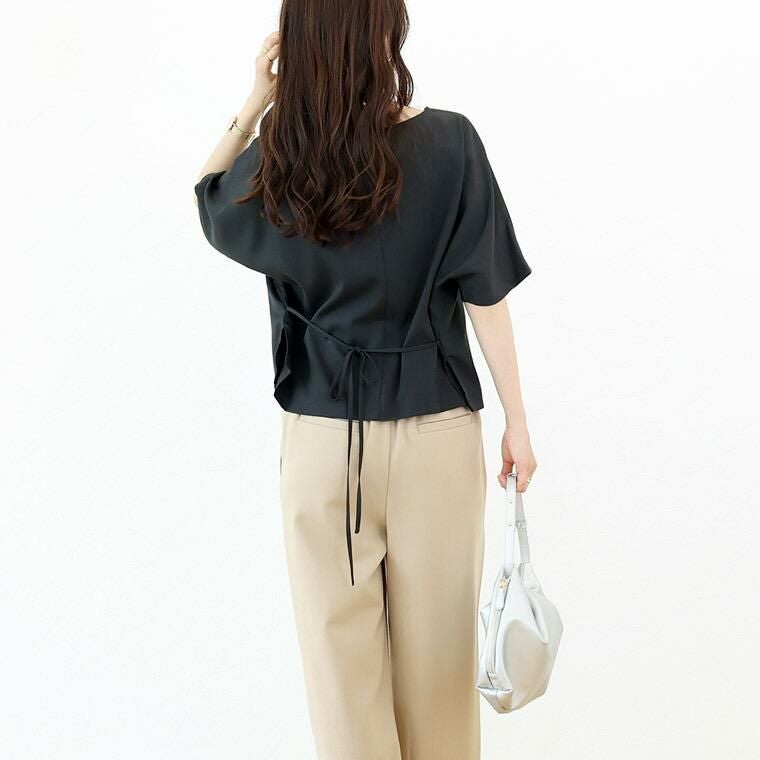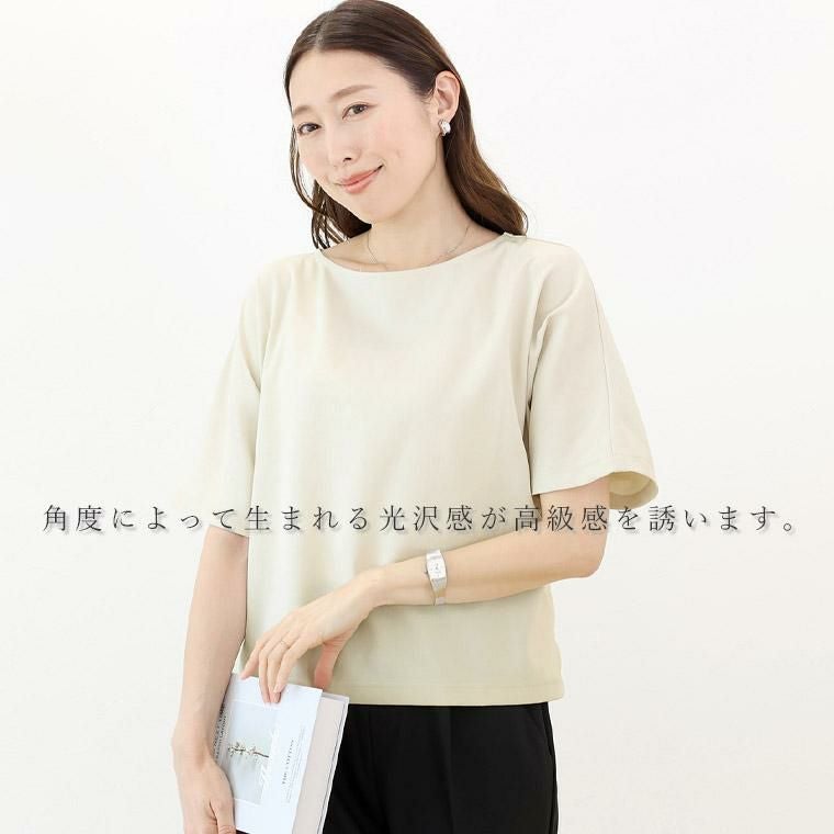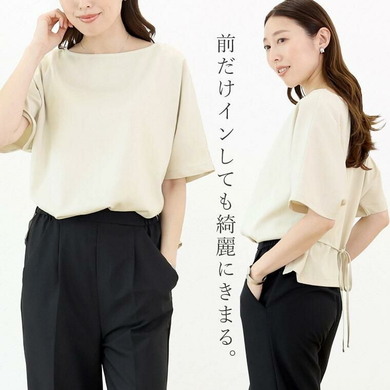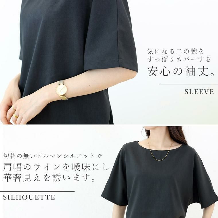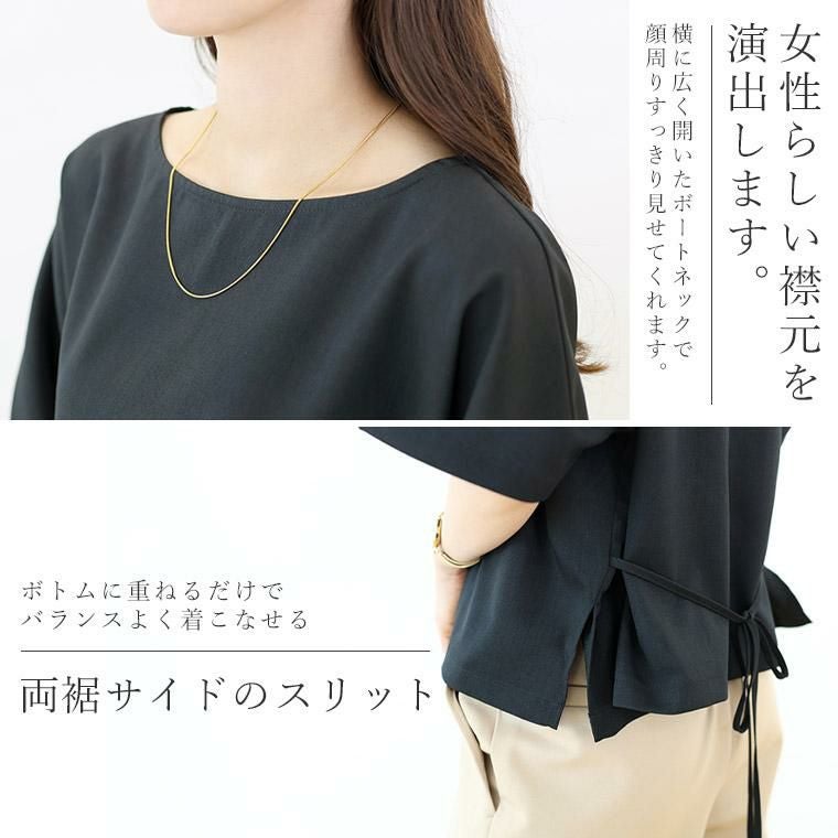 Tシャツ感覚で着られてきちんと感も見につく、被りタイプのプルオンブラウス。シームレスでミニマルなシルエットに共布の華奢なリボンがアクセント。綺麗見えする杢無地素材。伸縮素材を織り込むことで比較的シワになりづらい。角度によって生まれる光沢感が高級感を誘います。横に広く開いたボートネックで顔回りすっきり、女性らしい襟元を演出します。気になる二の腕をすっぽりカバーする安心の袖丈。切替の無いドルマンシルエットで肩幅のラインを曖昧にし、華奢見えを誘います。シンプルなデザインに共布リボンがアクセント。お好みで後ろでも前でも結べます。両裾サイドのスリットでボトムに重ねるだけでバランスよく着こなせます。