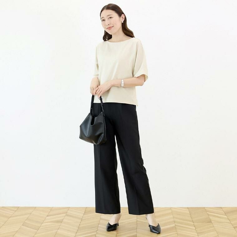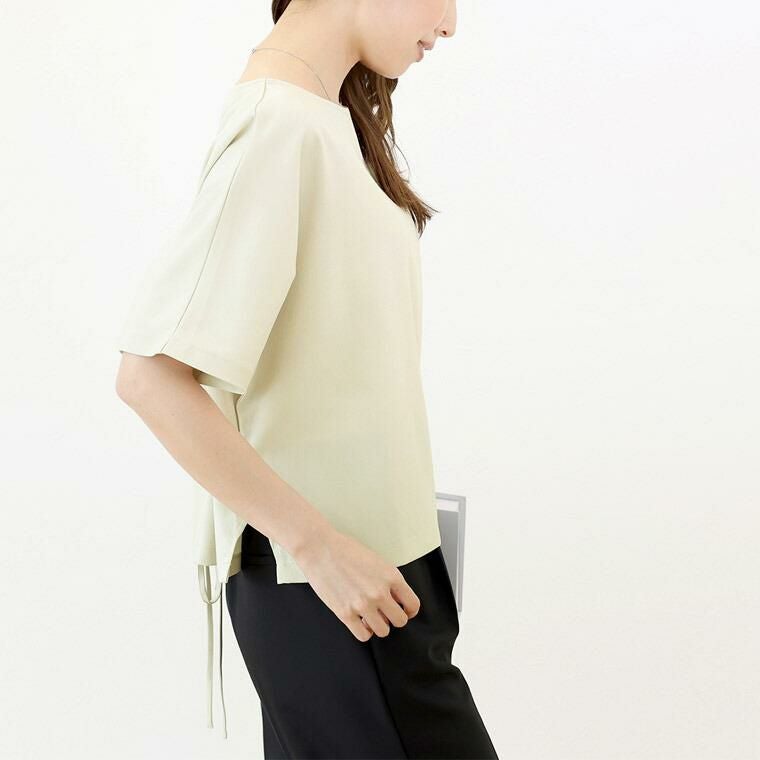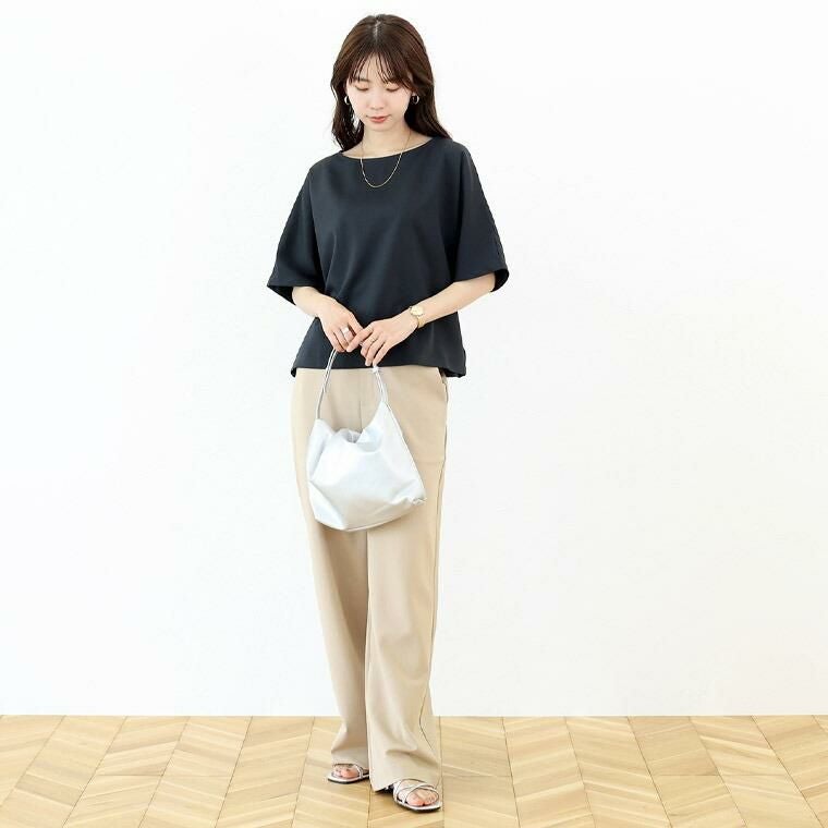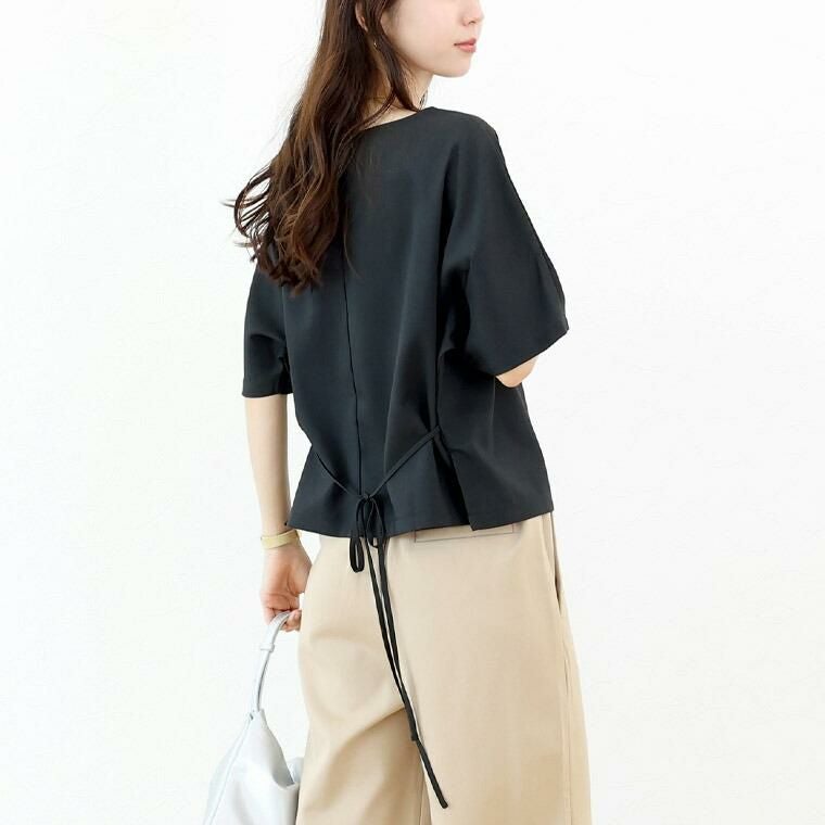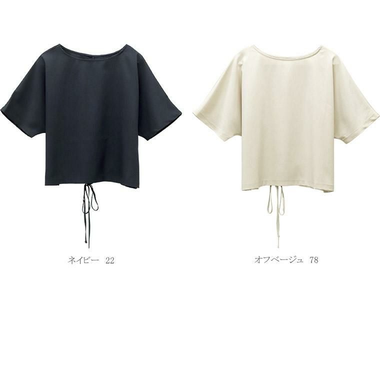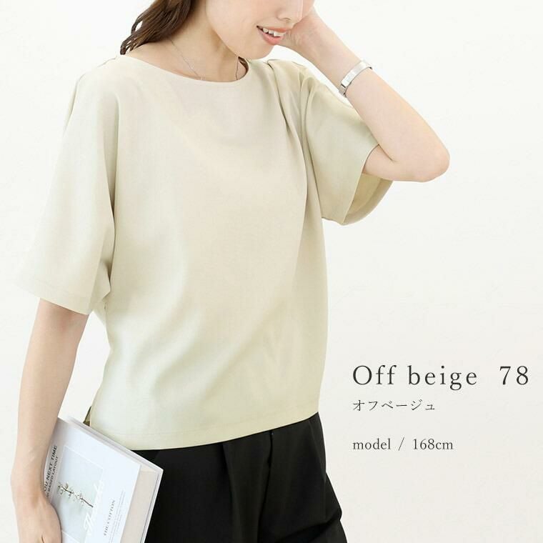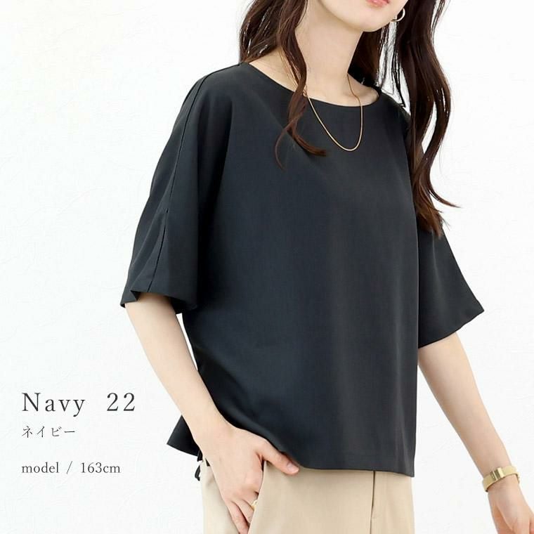 Tシャツ感覚で着られてきちんと感も見につく、被りタイプのプルオンブラウス。シームレスでミニマルなシルエットに共布の華奢なリボンがアクセント。綺麗見えする杢無地素材。伸縮素材を織り込むことで比較的シワになりづらい。角度によって生まれる光沢感が高級感を誘います。横に広く開いたボートネックで顔回りすっきり、女性らしい襟元を演出します。気になる二の腕をすっぽりカバーする安心の袖丈。切替の無いドルマンシルエットで肩幅のラインを曖昧にし、華奢見えを誘います。シンプルなデザインに共布リボンがアクセント。お好みで後ろでも前でも結べます。両裾サイドのスリットでボトムに重ねるだけでバランスよく着こなせます。