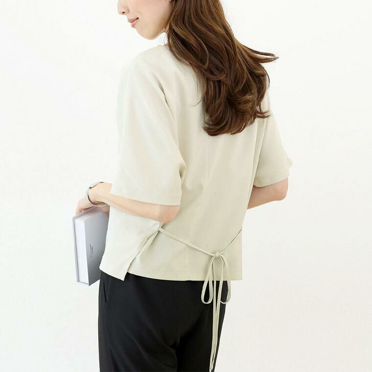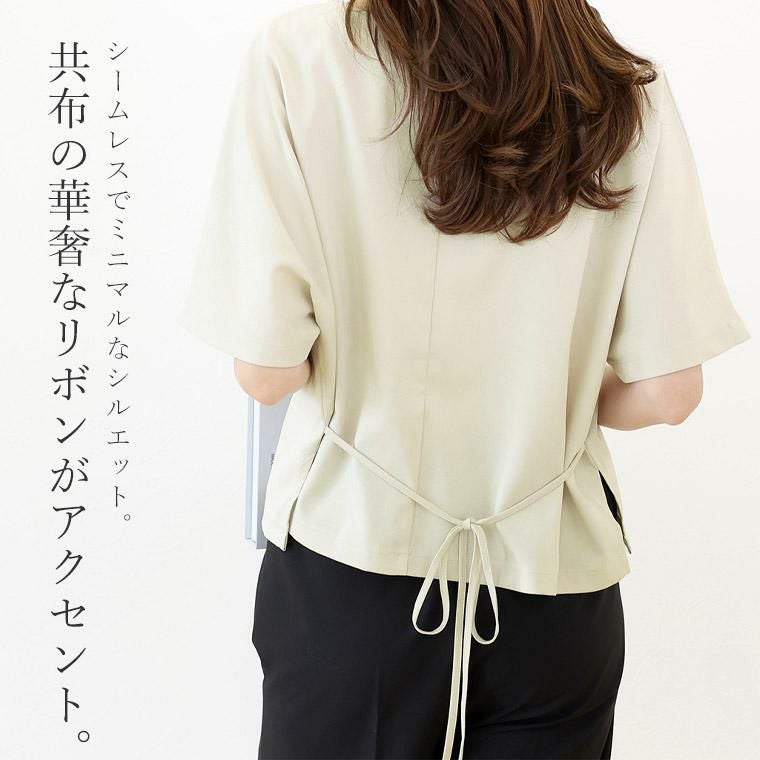 着丈はヒップにかかるくらい。袖丈は肘くらい。伸縮性はありませんがゆったりシルエットです。後ろのリボンでシルエットの調節ができ◎。ハリのある上品な素材感で、カジュアルになりがちな夏のコーデをキレイ目にしてくれそうです。