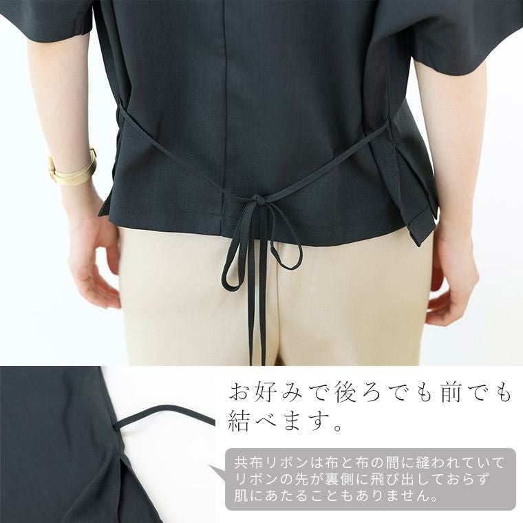 着丈はヒップが半分隠れるくらい。袖丈は肘から4cm下。全体にゆったりしたシルエットです。後ろにリボンがあり、少し強めに結ぶとウエストをスッキリ見せることができます。襟元は広いので顔もスッキリ見え◎。