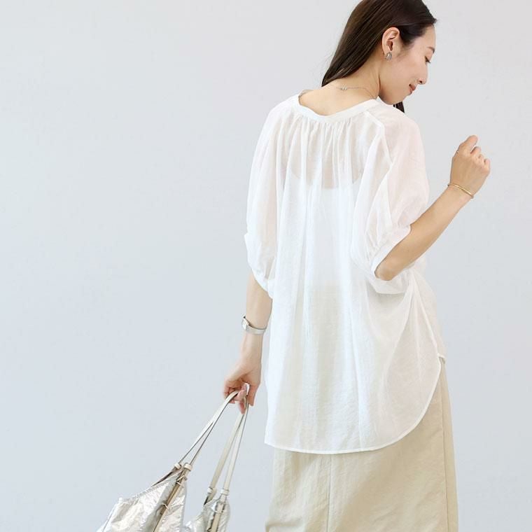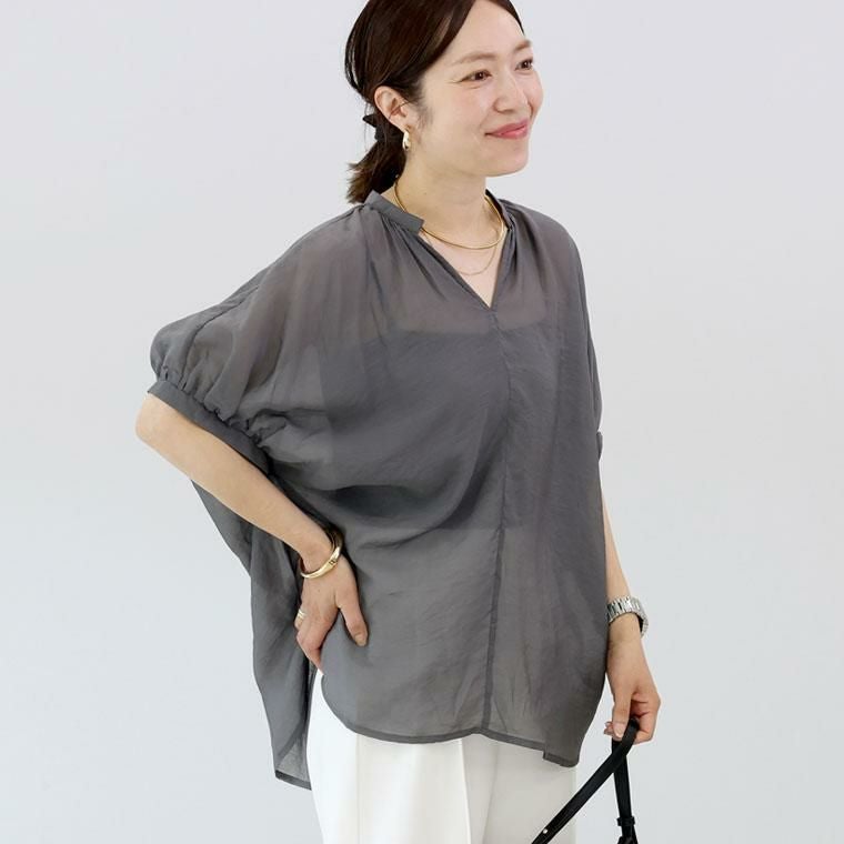 何にも着たくないときにおすすめな、極薄ボイルで仕立てたドルマンブラウス。まるで羽衣のような透け感のあるとても薄手生地で、見た目も着心地も涼しい。身体に張り付かないレーヨンとナイロンの混紡で上品な落ち感とひんやり感があります。ゆとりあるワイドなシルエットで体のラインをカモフラージュ。すっきりシャープなV字を描くスキッパー襟が抜け感を演出。襟元と袖口にはギャザーを寄せており、ほどよいニュアンスあるシルエットをつくります。着るだけで涼しげな着映えブラウスです。