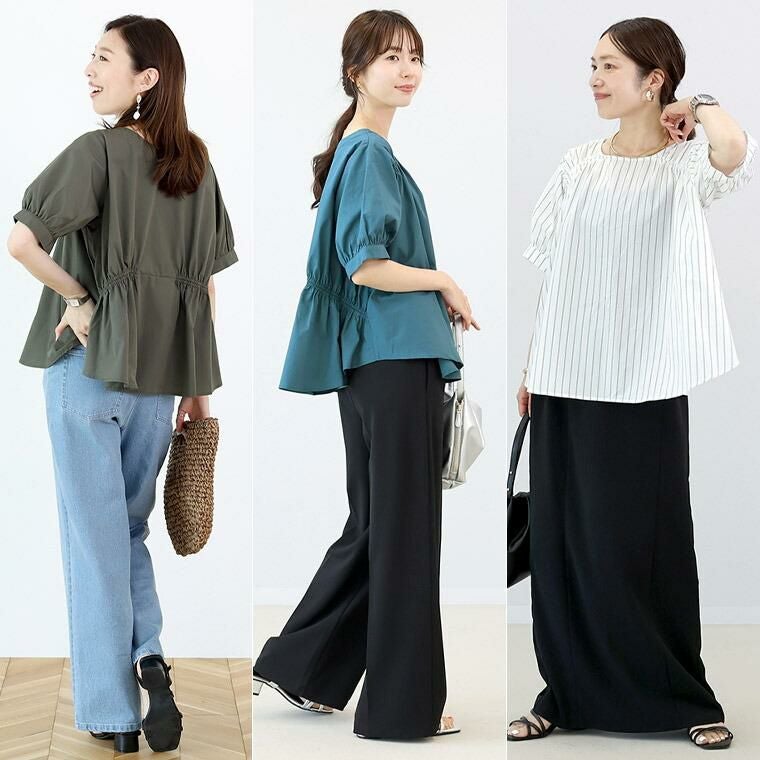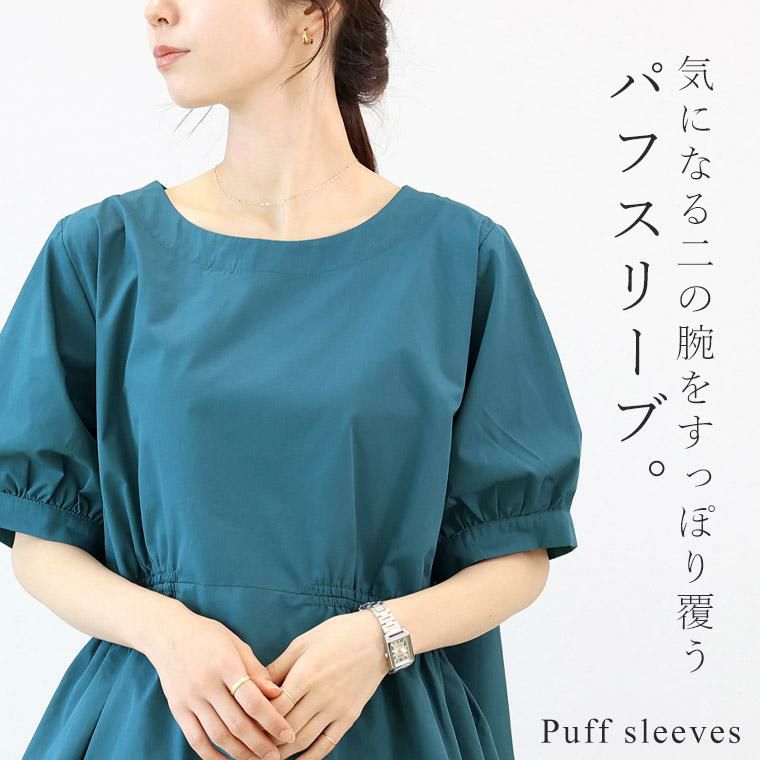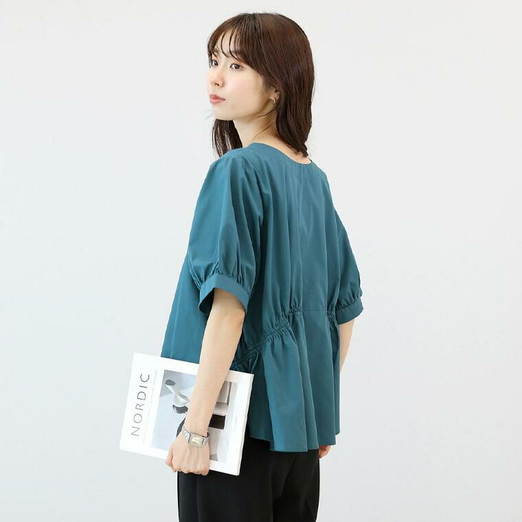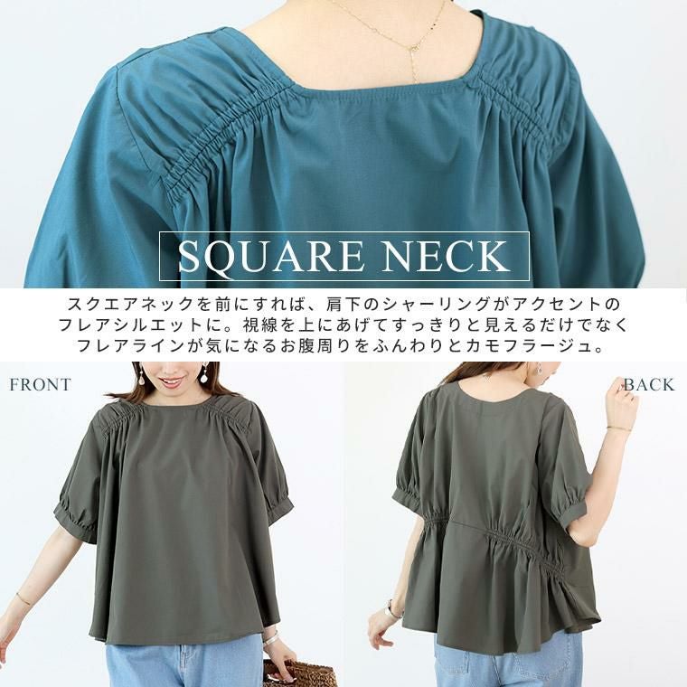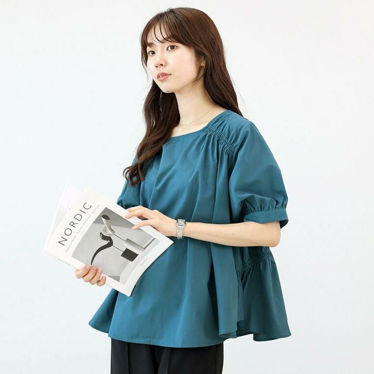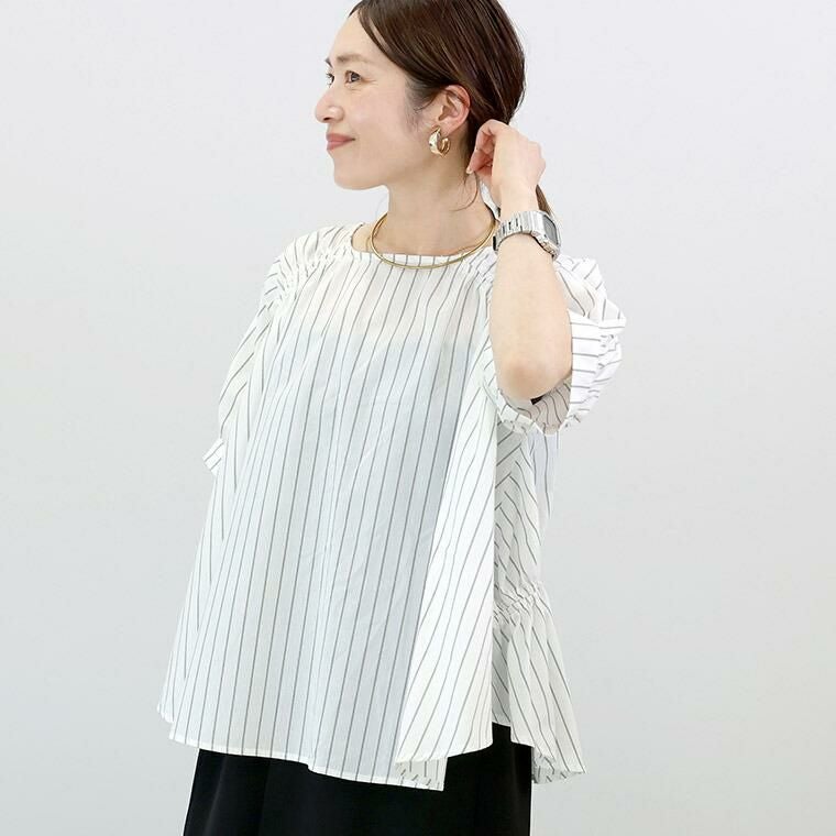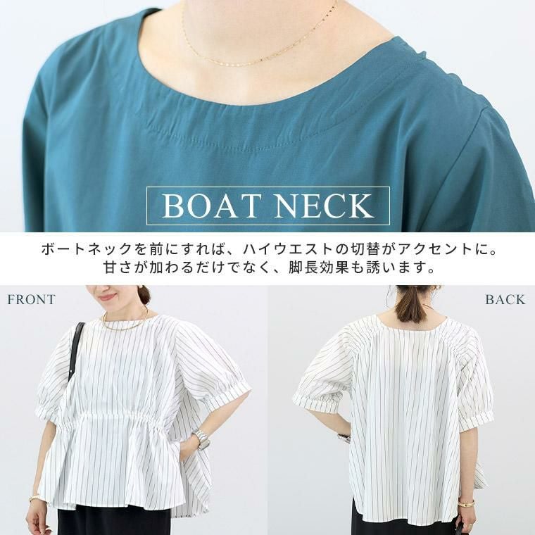 程よいハリのある布帛素材で仕立てたデザインブラウス。ほんのりと艶感のある生地で品よく映ります。前後で印象を変えて着られる2WAYデザインで、1枚で2着分の着回しが可能なお得感のあるアイテム。スクエアネックを前にすれば、肩下のシャーリングがアクセントのフレアシルエットに。視線を上にあげてすっきりと見えるだけでなく、フレアラインが気になるお腹周りをふんわりとカモフラージュ。ボートネックを前にすれば、ハイウエストの切替がアクセントに。甘さが加わるだけでなく、脚長効果も誘います。気になる二の腕をすっぽり覆うパフスリーブ。ゆとりのある身幅にやや長めの着丈で安心の着心地。上品なチャコールに、目を惹くスモーキーなブルー、爽やかな先染めのダブルストライプの色展開。カラーによって雰囲気が変わります。