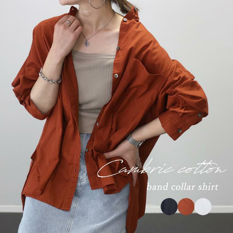 キャンブリックコットンバンドカラーシャツ 柔らかくさらりとした肌あたりの良い風合いと 発色の良さが魅力のインド綿で仕立てたバンドカラーシャツ。 通気性、吸水性に優れた素材で暑い季節も快適に着用 いただけます。シンプルなシルエットで着まわしやすく、 メイン使いはもちろん、ワンピースやタンクトップなどの上に 重ねて羽織りとしても、様々なコーディネートを楽しめる 大人ワードローブのお役立ちアイテム。また 紫外線や室内での冷房対策としても活躍。