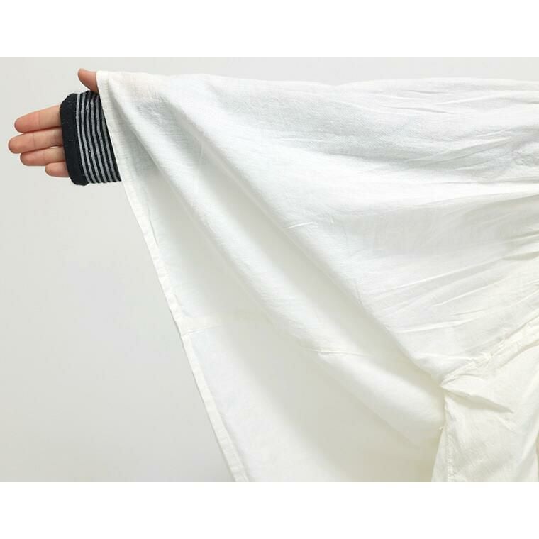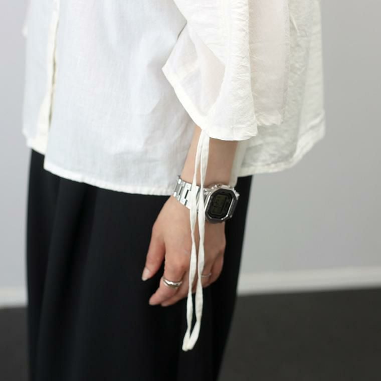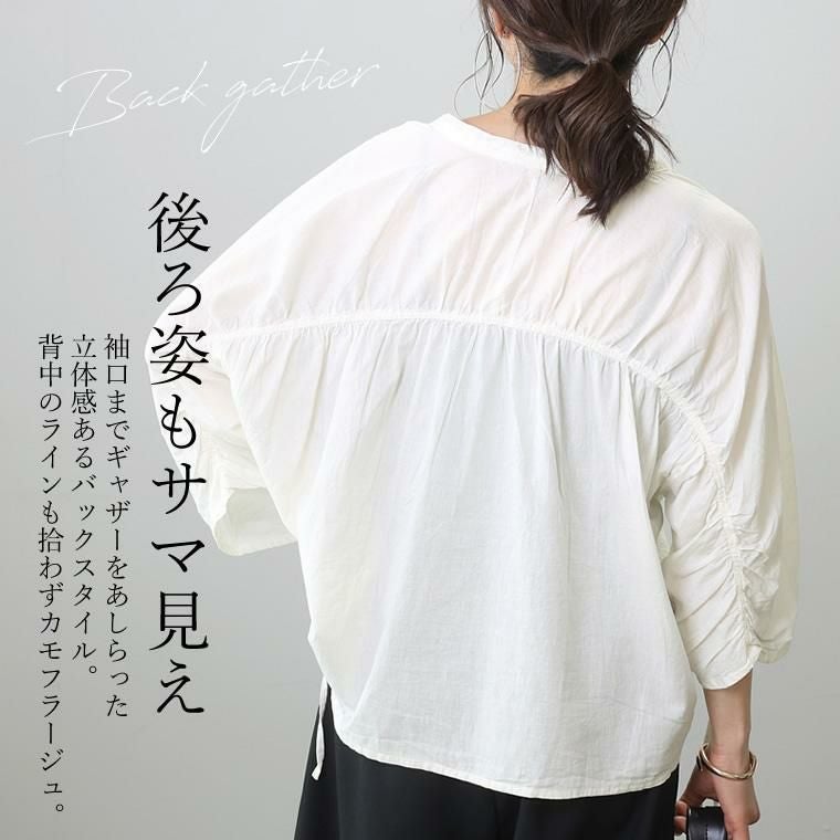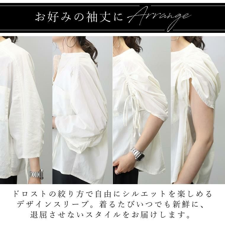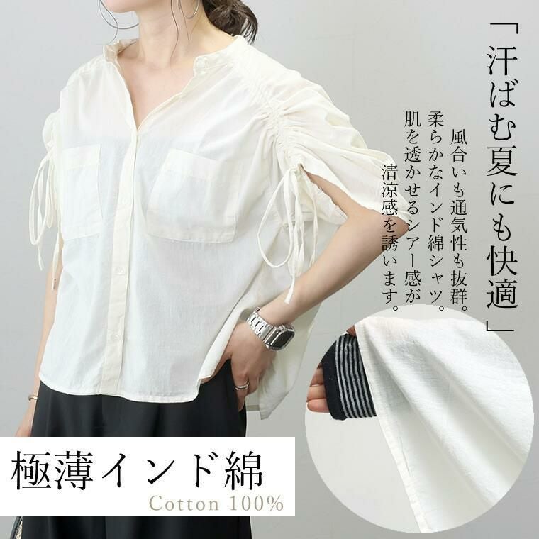 袖の絞り方で自由にシルエット、袖丈を変えられるシャツブラウス。袖のドロストをギュッと短く絞って丸みあるシルエットにしたり、ラフに伸ばしてドルマンシルエットで着たり、お好みのスタイルで着こなせます。袖口の共布リボンもトレンド感ある程よく甘いアクセントに。生地は極薄のインド綿シャツ。風合いも通気性も抜群で、汗ばむ季節も快適です。襟元はボタンの開け方で表情の変わるバンドカラー。ボタンをすべて開ければ羽織りとしても活躍します。ベーシックなモノトーンの無地と明るいブルーのストライプ、どのカラーも使いやすい3色展開です。