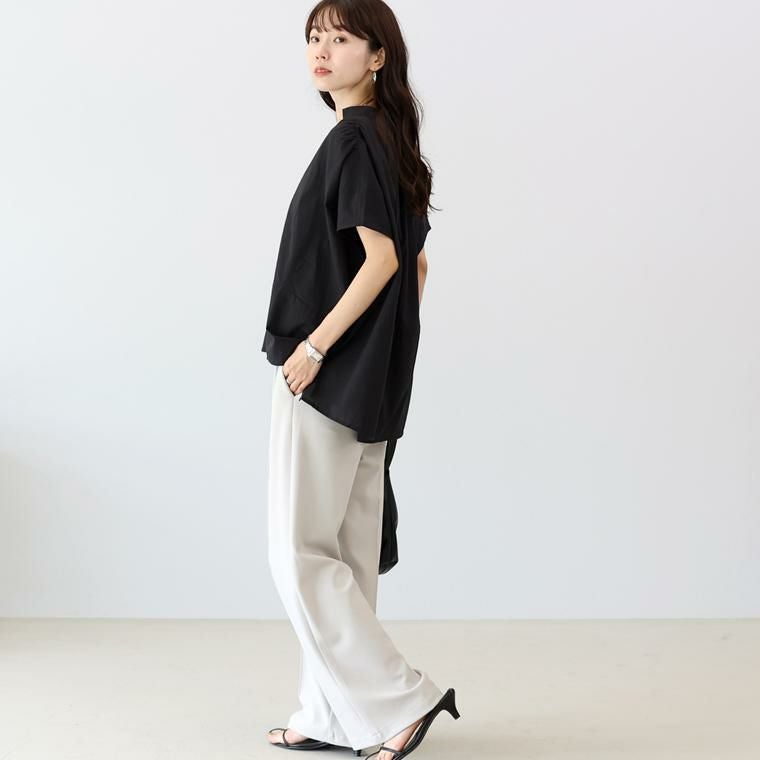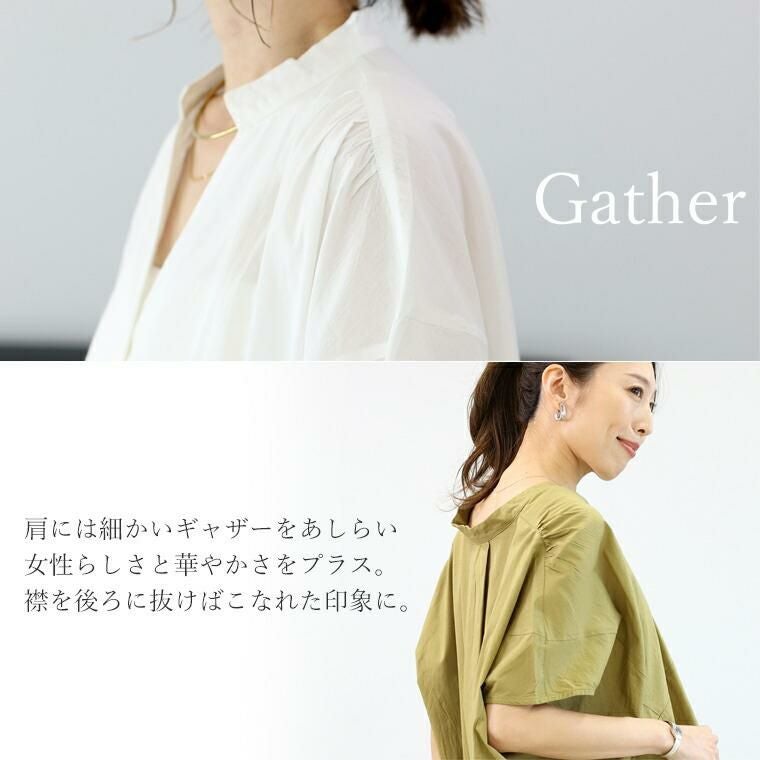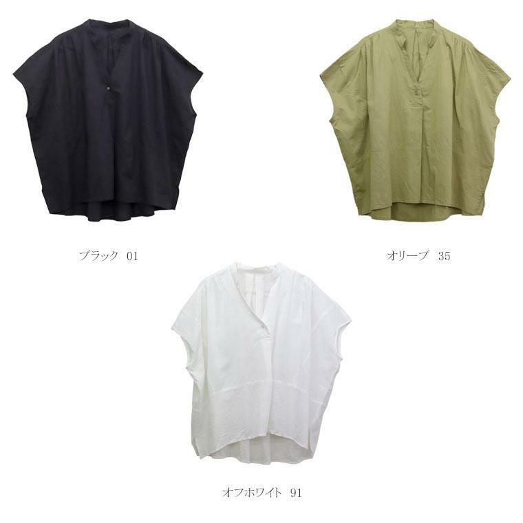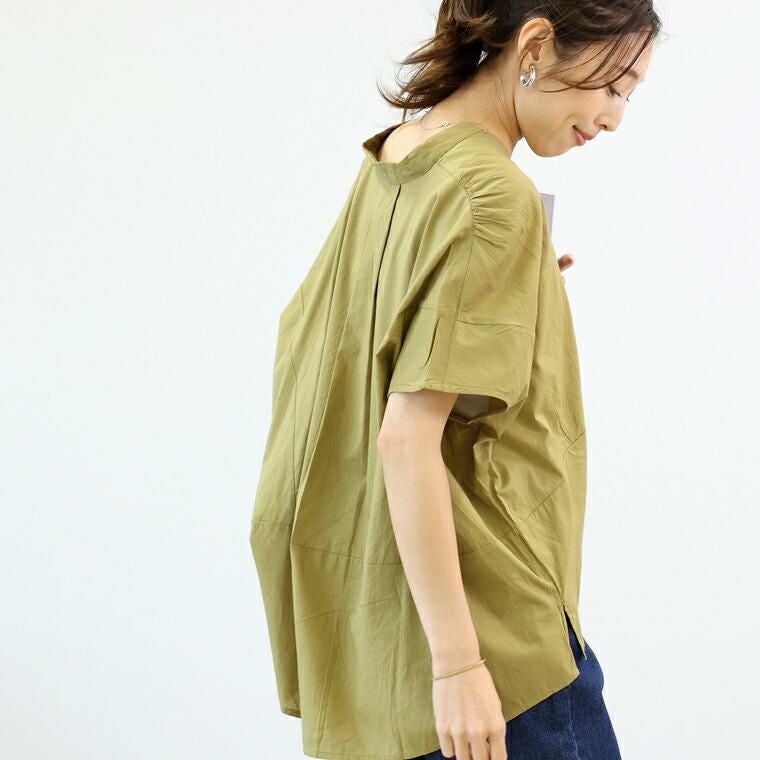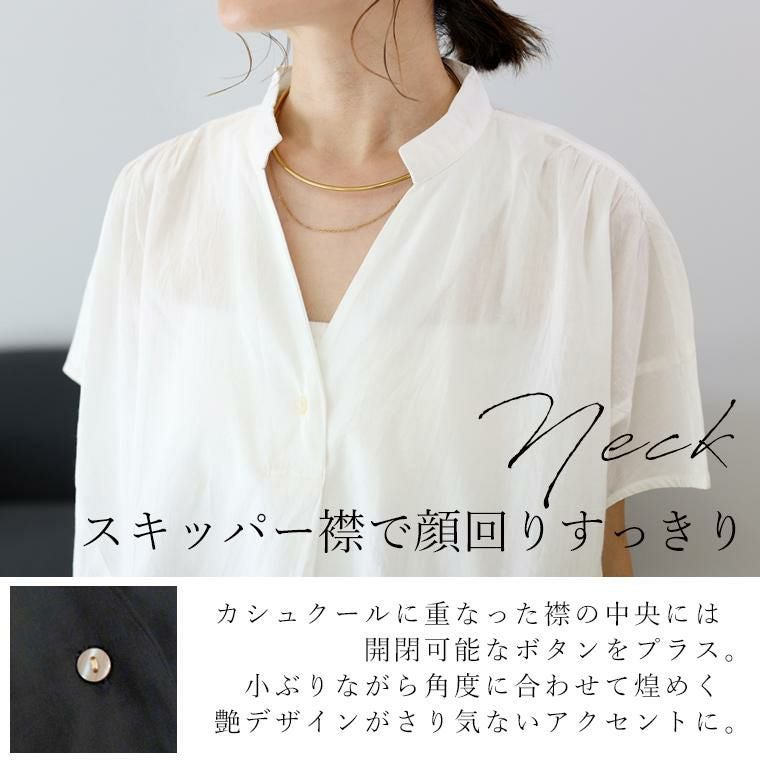 身体が泳ぐたっぷりワイドなシルエットと顔回りをシャープに演出するスキッパー襟が絶妙バランスのゆるブラウス。柔らかでさらりとした風合い抜群のインド綿で、風通しにも吸水性にも優れ、汗ばむ季節にも快適な着心地です。綿布帛特有のしわになりやすい性質ですが、綿100%にしか醸し出せない質感と着心地が魅力です。ゆったりとしたドルマンシルエットで着心地リラックス。裾と斜めの切替で自然なコクーンラインを描き、さっと着るだけでこなれ感のあるスタイルに。パンツにもスカートにも合わせやすく、まだまだ暑さの残る長い夏に役立つアイテムです。