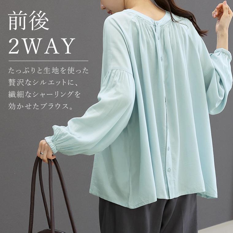 たっぷりと生地を使った贅沢なシルエットに、繊細なシャーリングを効かせた前後2WAYブラウス。とろみのあるレーヨン素材が動くたびに揺れ、自然と女性らしい印象に。ボタンを開けて抜き気味に着るだけで、こなれた大人のスタイルが完成します。前後どちらでも着られる2WAY仕様で着回し自在。ボタンを前にすればバンドカラーで甘すぎずすっきりした印象に。前後の襟元シャーリングが顔まわりを華やかに。袖付け根のシャーリングで立体感&細見え効果。ゆったりワイドな身幅で身体のラインを拾いません。腰までしっかり隠れる安心の着丈。袖口ゴムでたくし上げやすく抜け感も簡単に。ボタンを開けてラフに羽織りとしても使えます。きれいめにもカジュアルにも振れる万能デザイン。