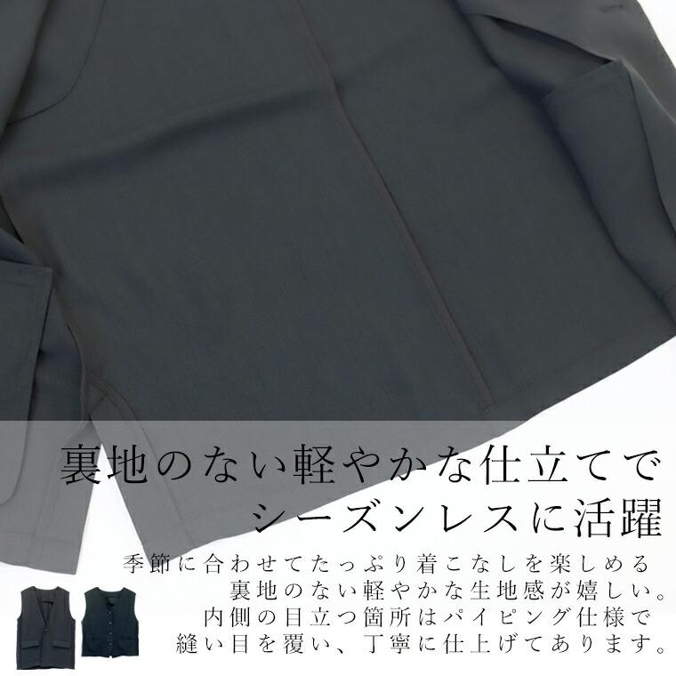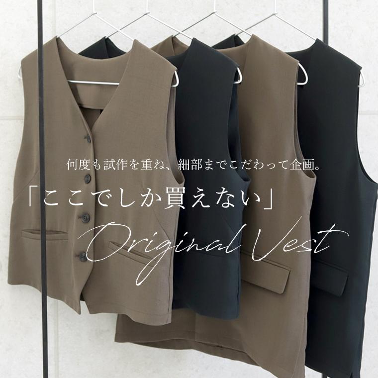 細部までこだわって企画した、ここでしか買えないオリジナルアイテム。「キレイ見え」「きちんと感」「カバー力」、すべてを叶える大人のためのベストです。お好みで選べる2つのシルエット、さらにフィットデザインはサイズもお選びいただけます。 生地はどちらも上品な杢調ツイル生地。透け感があり軽やかさと高見えを両立。サラッとした肌触りで、季節の変わり目も快適にお過ごしいただけます。シワになりにくく、イージーケアなのも嬉しい。シームレスな襟ぐり&脇まわりで、滑らかな着用感と上品見えをキープしてくれます。内側の目立つ箇所はパイピング仕様で縫い目を覆う丁寧な仕上げ。裏地なしの軽やかな仕立てです。※生地が重なった箇所と1枚生地の箇所で多少透け具合が異なります。同素材のボトムスとのセットアップも可能で、着こなし自在。