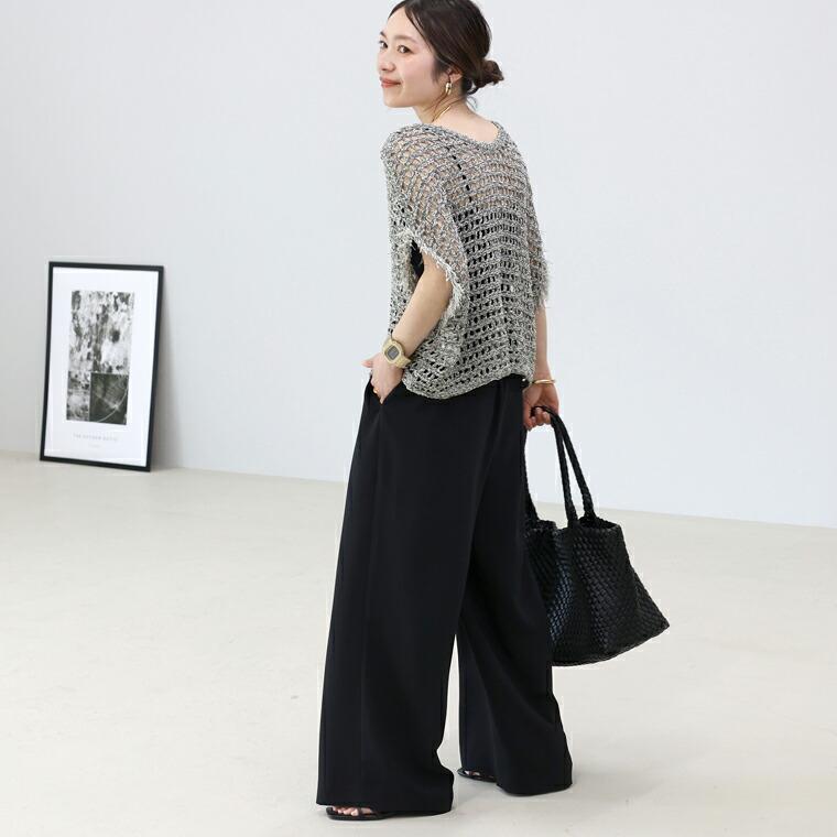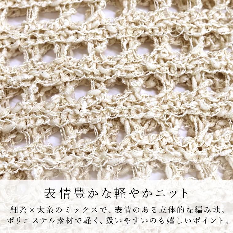重ねるだけで抜け感とこなれ感を演出する、透かし編みニットベスト。ざっくりとした編み地が軽やかな印象を与え、シンプルなコーデにプラスするだけで今っぽく仕上がります。細糸と太糸をミックスした立体感のある編み地で、表情豊かな仕上がりに。前後2WAY仕様で深UネックとVネックの両方を楽しめ、着こなしの幅が広がります。ワイドな身幅と落ち感のあるシルエットで体のラインを拾わず、自然に体型カバーも叶えます。軽く扱いやすいポリエステル素材でロングシーズン活躍する一枚です。