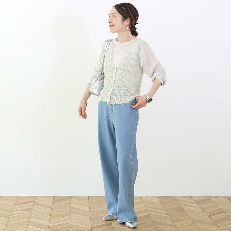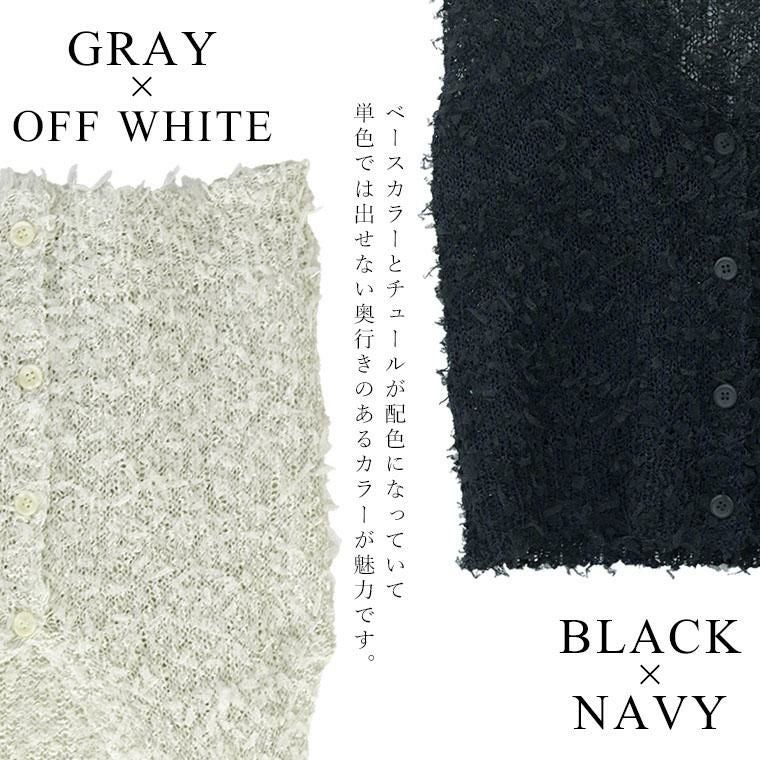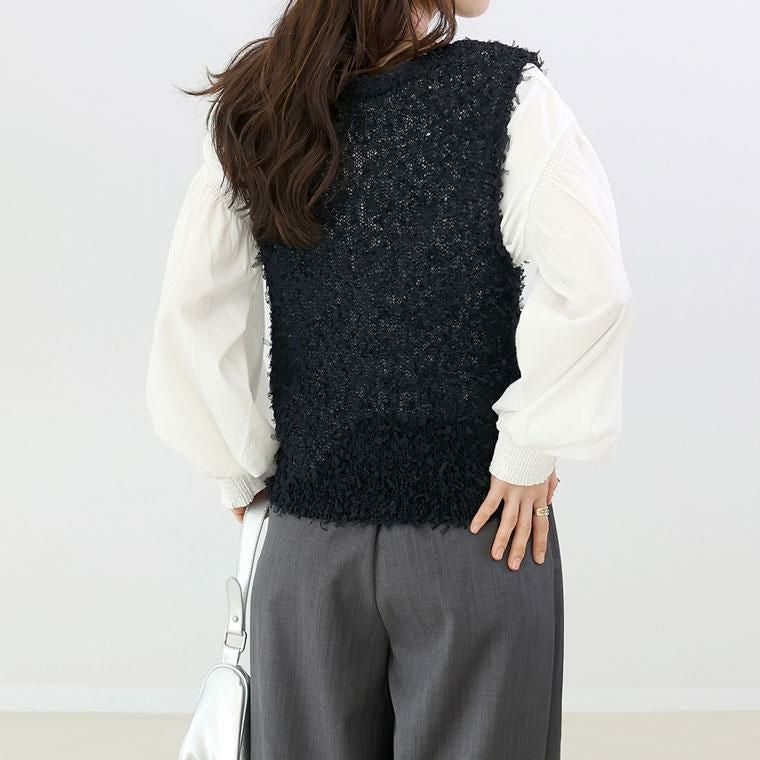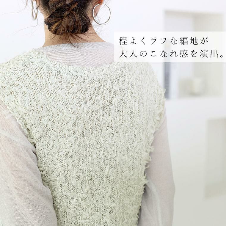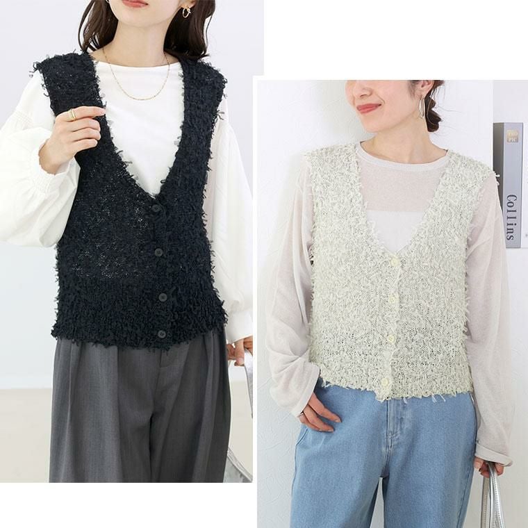 トレンド感がありながら、品よく纏える大人のベスト。麻タッチの風合いと、チュールテープヤーンの繊細なニュアンスが絶妙に調和。立体感のある編地が、さらりと着るだけでスタイリングを格上げします。程よくラフな編地が、大人のこなれ感を演出。ブラック×ネイビー、グレー×オフの上品な配色。単色では出せない奥行きのあるカラーが魅力です。深めのVネックが顔周りをすっきり見せ、女性らしさを引き立てます。ボタン付きで、着こなしにアクセントをプラス。長袖にもノースリーブにも重ねやすく、シーズンレスに活躍する一枚です。