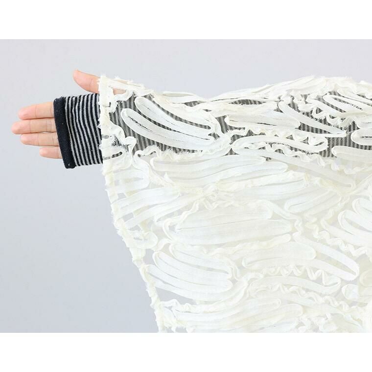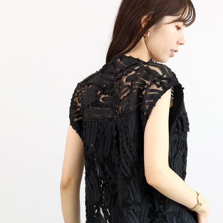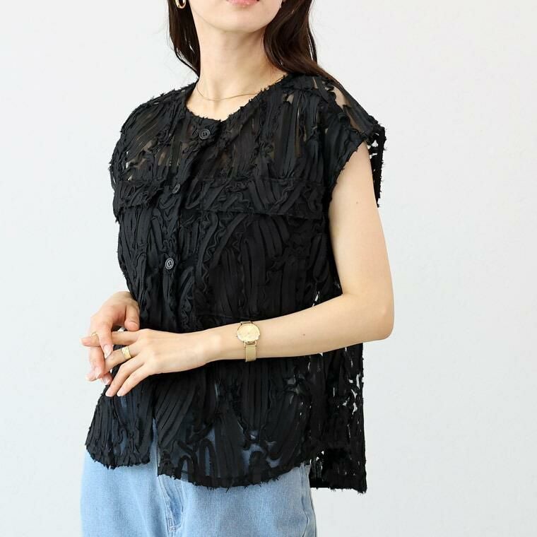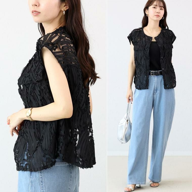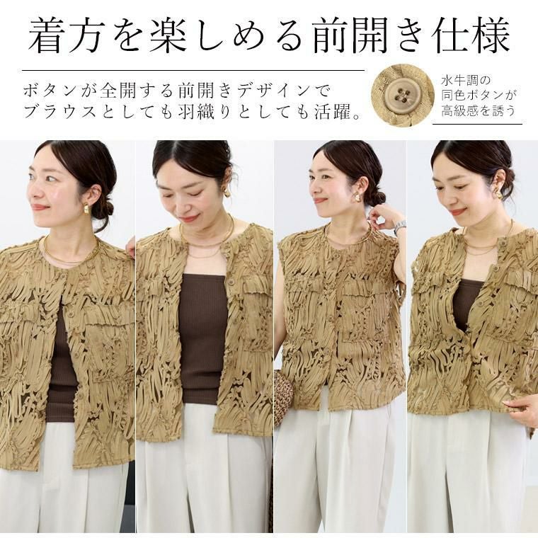 表面変化のある刺繍チュール生地で仕立てたノーカラーベスト。チュールのベースにランダムにあしらったコード刺繍生地を採用。立体感のある風合いで主役級の華やかさ。チュールから覗く肌見せが女性らしさと清涼感を高めます。前開きデザインで、スリーブレスブラウスとしても羽織りとしても活躍。ボタンの開け方で表情が変わる着こなし幅の広さも魅力です。襟元はすっきりとしたノーカラーのクルーネック。肩の出過ぎない計算されたノースリーブで、大人の女性も着やすいシルエットになっています。一着投入するだけでおしゃれ上級者に仕上がる、着映え感たっぷりのアイテムです。