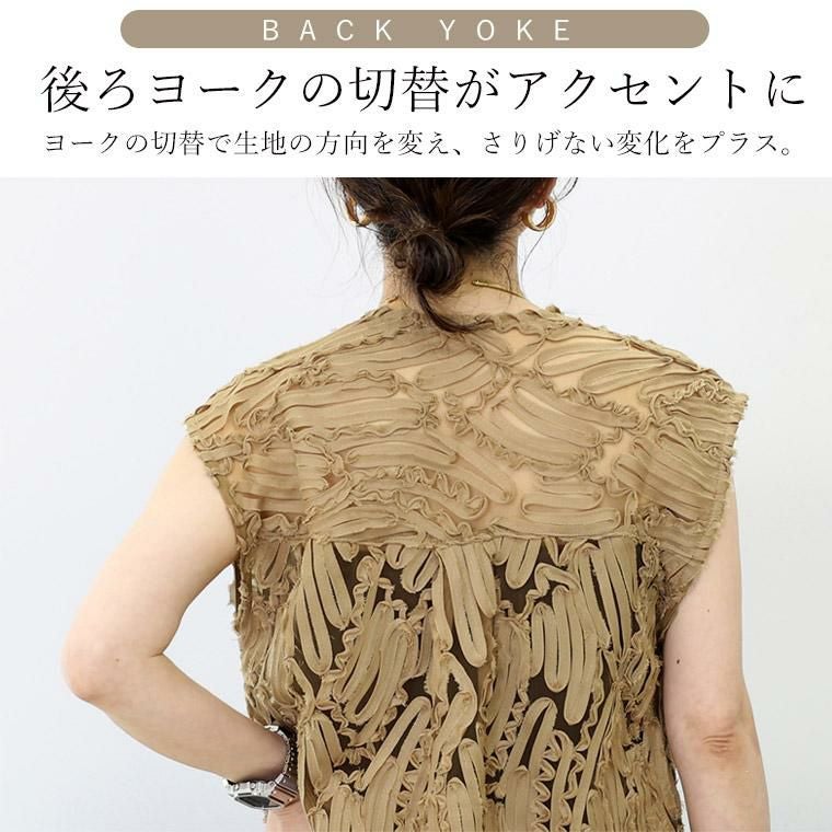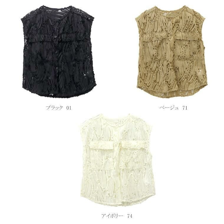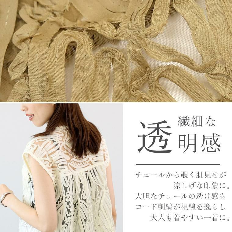 ベスト ブラウス トップス チュール 刺繍 コード刺繍 シアー 透け感 ノースリーブ スリーブレス フレンチスリーブ フレンチ 華奢 着痩せ 着やすい クルーネック 前ボタン 羽織り スキッパー ポケット デコルテ シンプル キレイ見え きれいめ キレイめ 綺麗め 上品 楽ちん イージー イージー素材 ルーズ ゆったり くるーねっく ゆるめ リラックス おしゃれ お洒落 体型カモフラージュ 大人め ブラック クロ 黒 黒色 ベージュ アイボリー 白 ホワイト オフホワイト カラバリ豊富 大きめ 大きい ワンマイルウエア ワンマイルウェア レディースファッション 無地 ラクチン らくちん 楽ちん 動きやすい プラスサイズ 着痩せ 華奢見え 脚長 脚長効果 ゆったりサイズ ゆる すっきり カバー 体型カバー きちんと シンプル カジュアル ナチュラル ベーシック オフィス オフィスカジュアル テレワーク 会議 食事会 ランチ 女友達 参観日 二次会 飲み会 上品 知的 女性らしい 女らしい 着映え オンライン飲み会 着回し 大人 大人カジュアル オトナ 女性 綺麗 きれい キレイ キレイめ 高見え 上質 大きいサイズ 細見え 女性服 アースカラー フリーサイズ 楽 ノンストレス 動きやすい ゆったり 高級感 母の日 プレゼント ギフト 贈り物 S M L LL 2L XL 20代 30代 40代 50代 おしゃれ パ―ト バイト 仕事 仕事用 ユニフォーム 春夏 春 夏 秋冬 秋 冬 お洒落 オシャレ かわいい 可愛い カワイイ かっこいい カッコいい FUNNY COMPANY ファニーカンパニー ふぁにーかんぱにー ファニカン