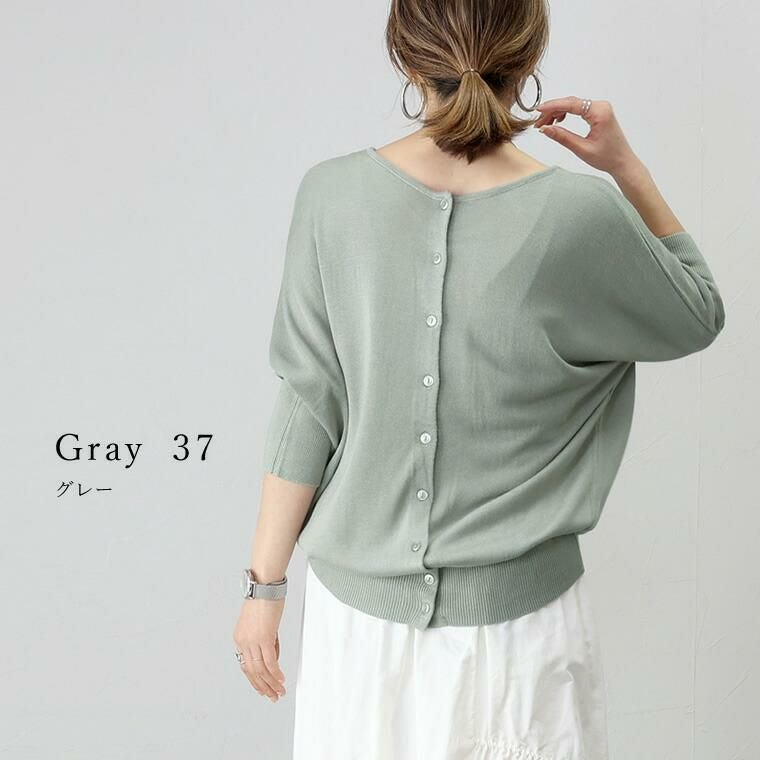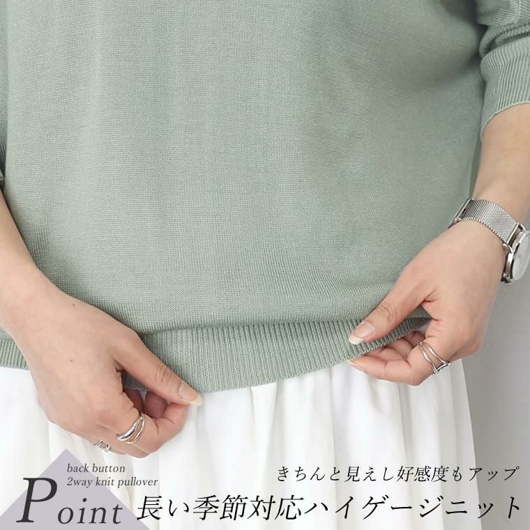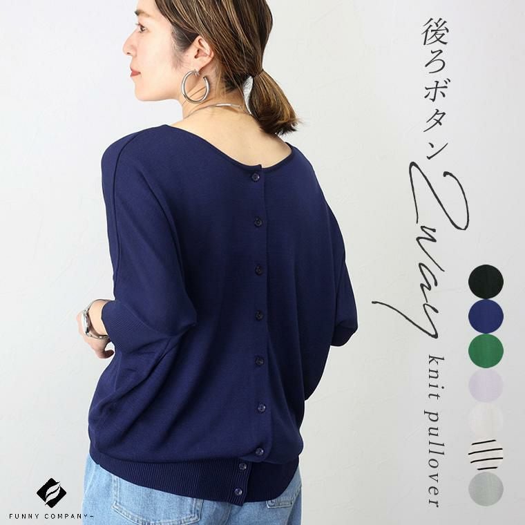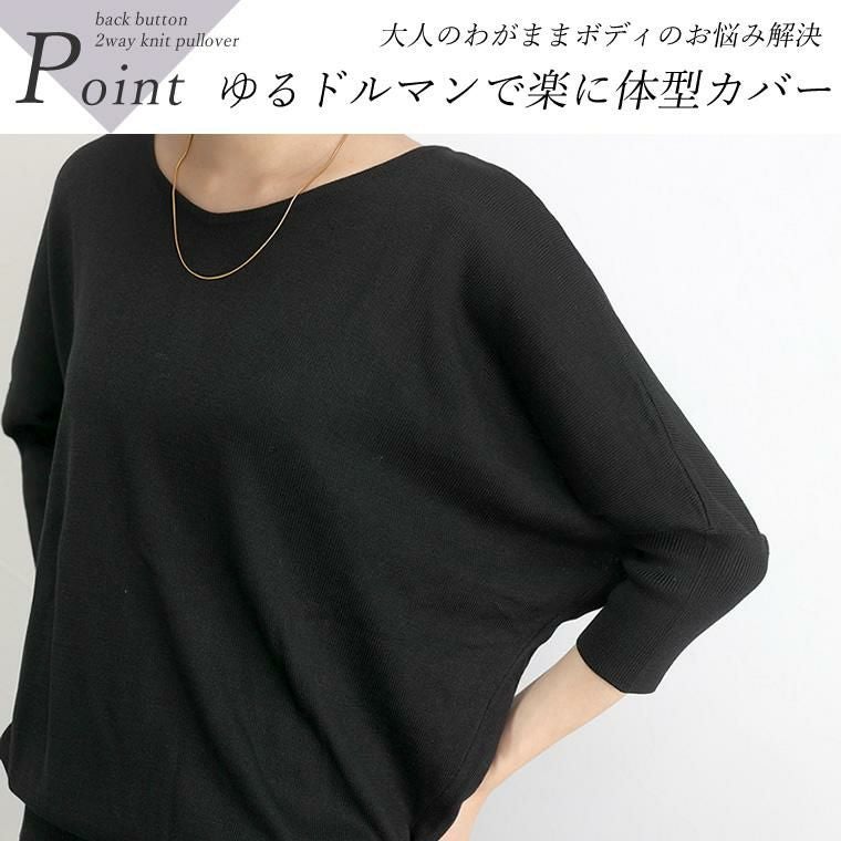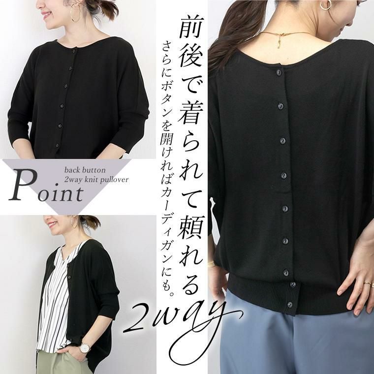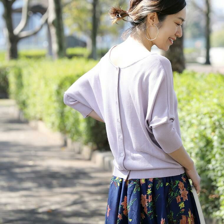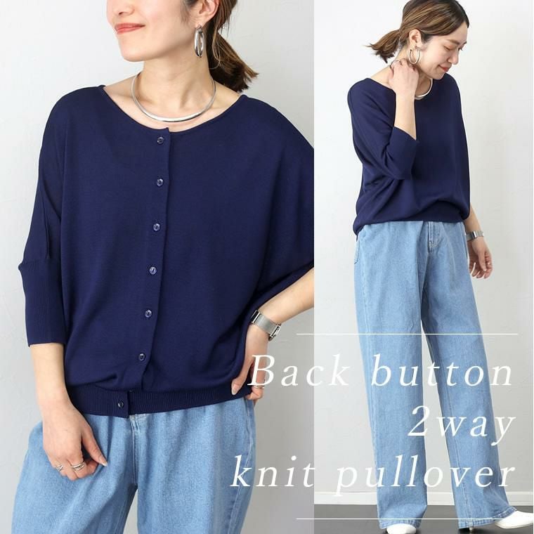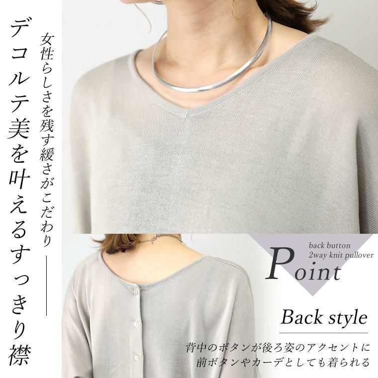 後ろボタン2wayニットプルオーバー デコルテラインをきれいに見せる緩やかなVネックにゆるいドルマンシルエット、 後ろボタンデザインが女性らしいニットプルオーバーは、カーディガンとしても使える 優秀2WAYアイテム。きちんと感のあるハイゲージの編み目でコーデを選ばず 着まわしやすく毎日のコーデも思いのまま。ワードローブに絶対使えるお役立ちアイテム。