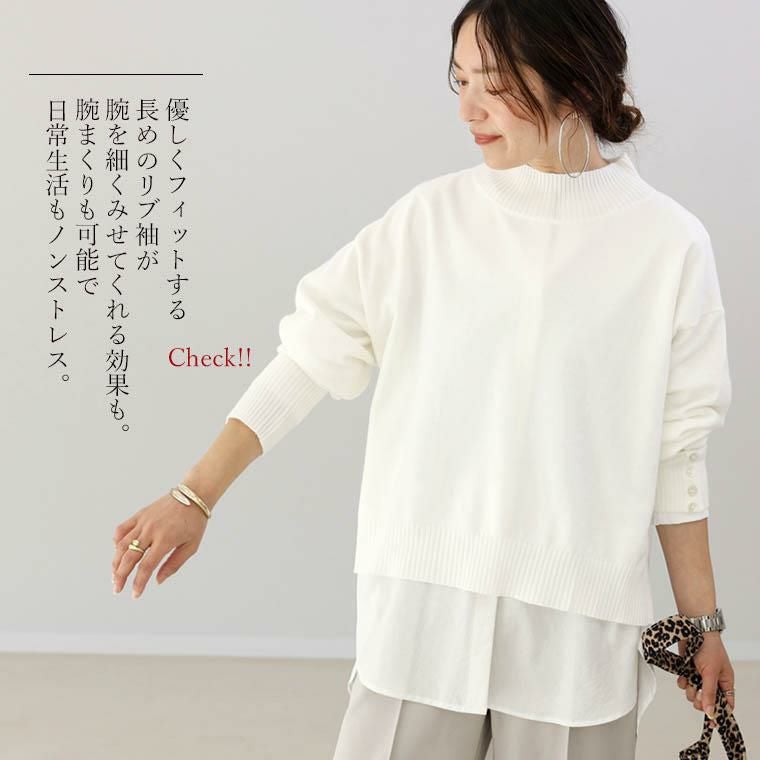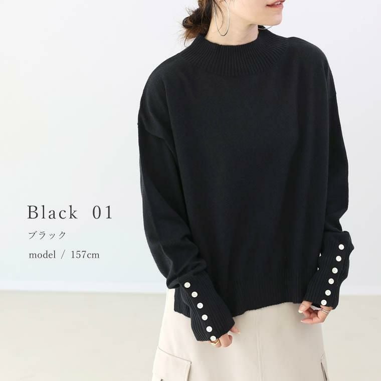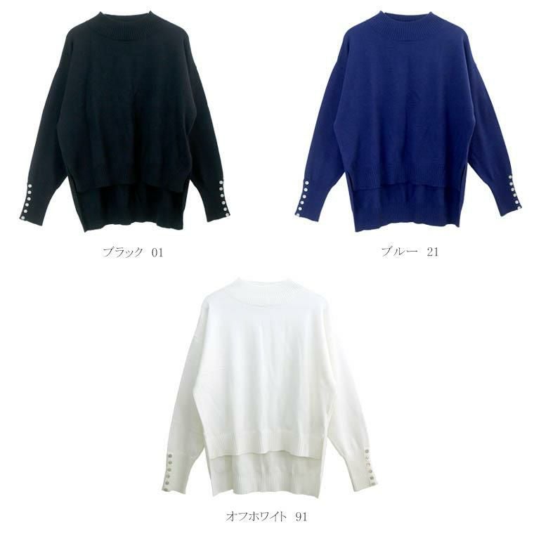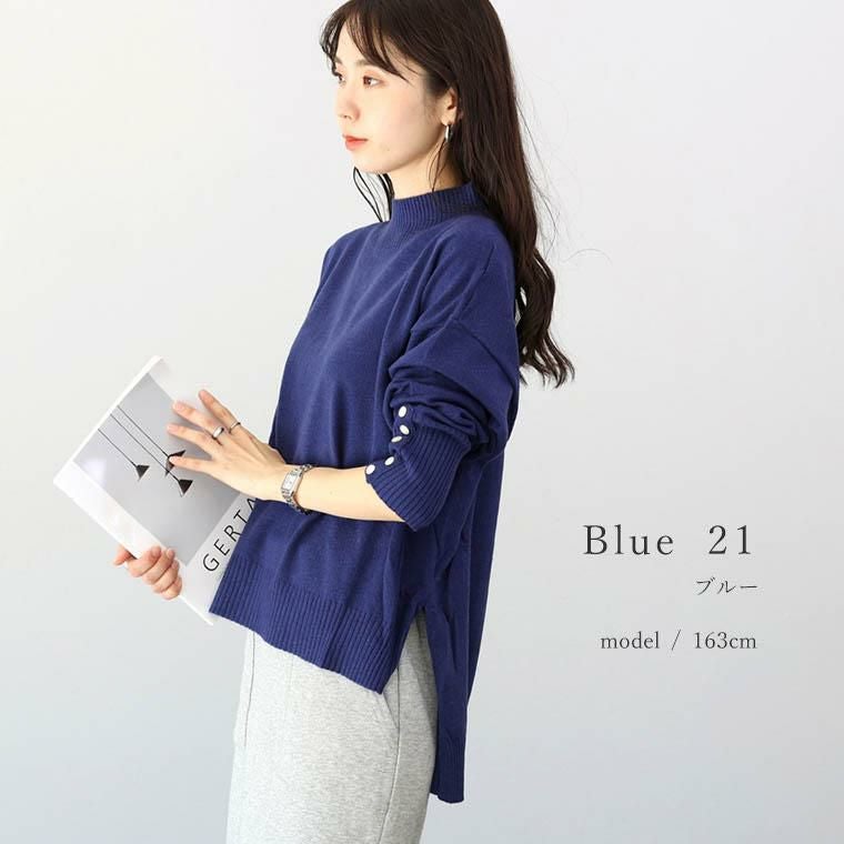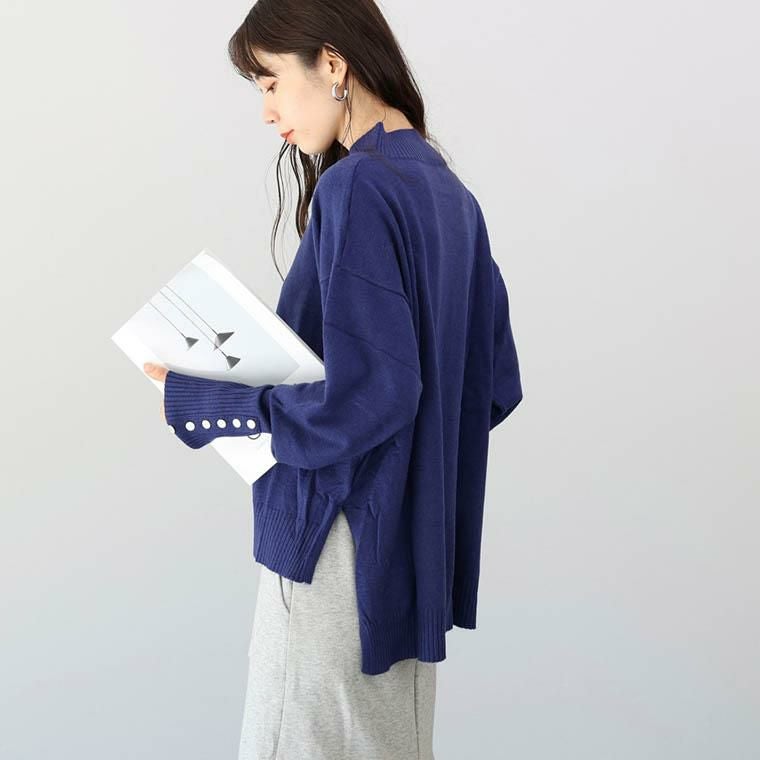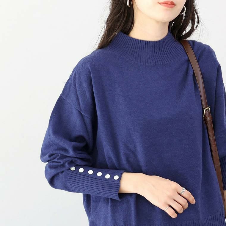 スタンドネックやわらかストレッチ袖ボタンニットプルオーバー