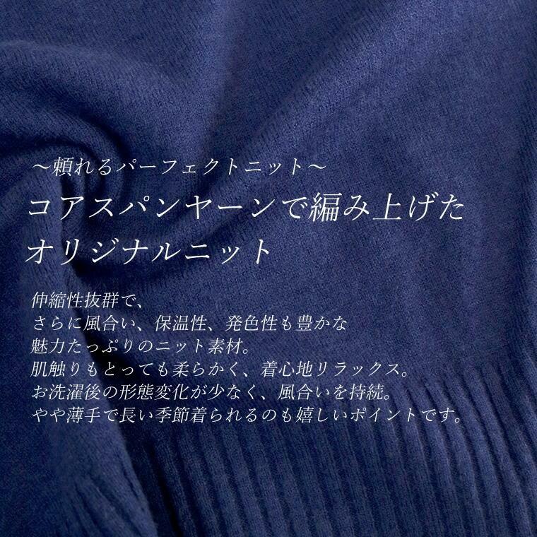肌触りにもデザインにもこだわった大人のためのオリジナルニット。コアスパンヤーンで編み上げた伸縮性抜群のニットで、肌触りとてもやわらか。さらに、風合い・保温性・発色性豊かで、お洗濯後の形態変化が少なく、素材の良さをキープ。魅力満載の素材です。シルエットは知的な印象を与えるスタンドネックに、自然な丸みを描くコクーンで体型カバーにも一役。長めのリブ袖には天然の貝ボタンを並べ、煌めくアクセントを。旬のレイヤードスタイルにも頼れる、着心地快適なリラックスニット。