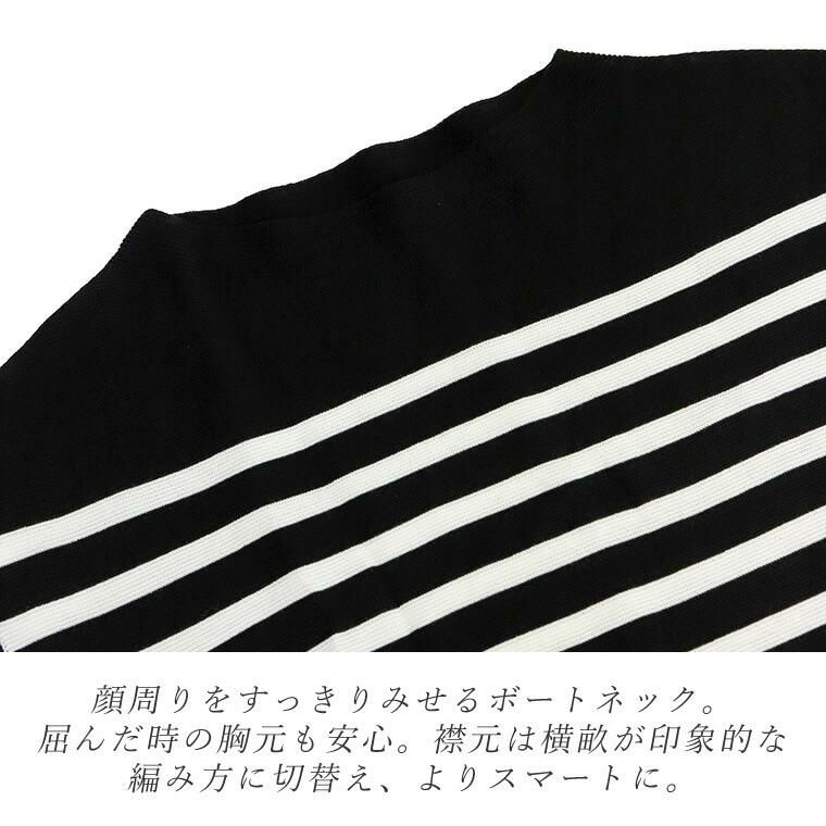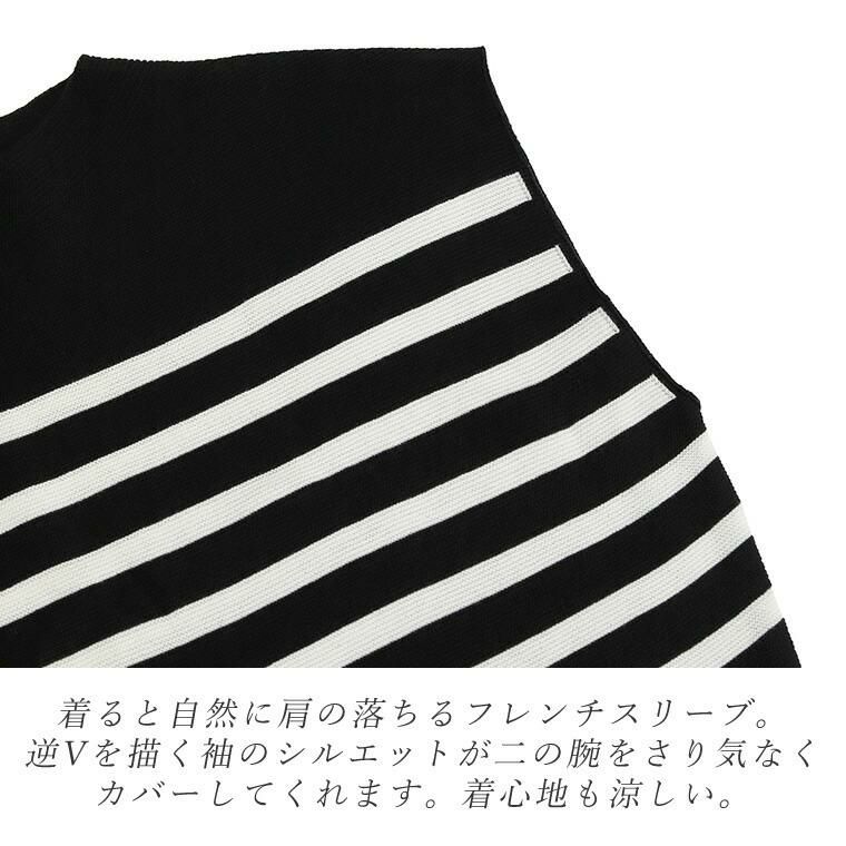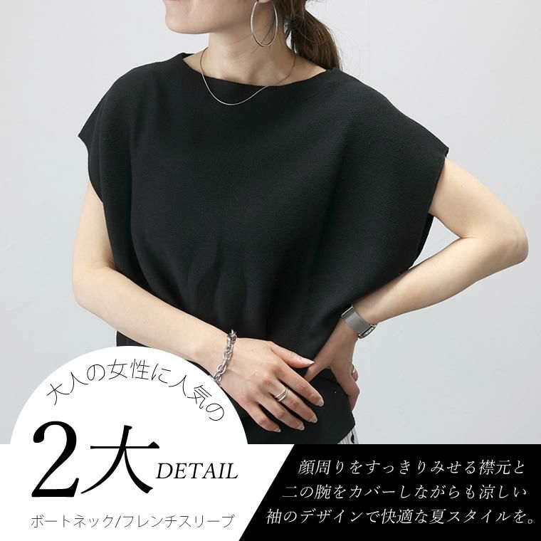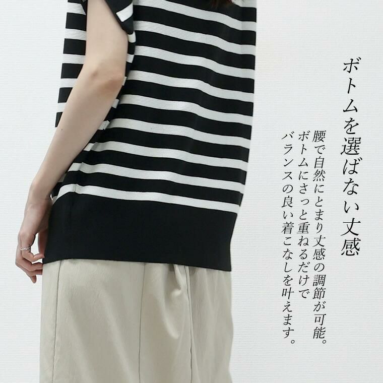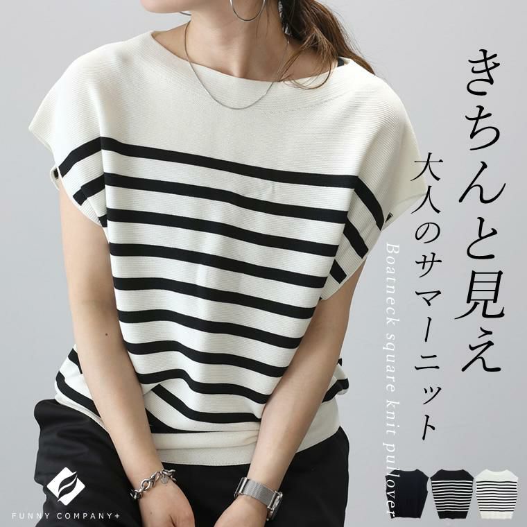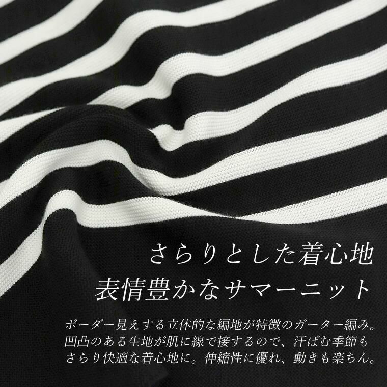 ボートネックスクエアニットプルオーバー カットソーよりきちんと見え。大人の女性におすすめしたい サマーニットです。ボーダーのように見える凹凸感のあるガーター編みで、 立体的な編地が肌に線で接し、さらり、快適な着心地に。 伸縮性にも優れ、動きもノンストレス。顔周りをすっきりみせる ボートネックが、きれいめな印象を与えます。さらに、肩から二の腕を カバーする袖丈は涼しく、一枚でも抵抗なく着られます。羽織りを重ねた時に もたつきにくいのも嬉しい。スカートともパンツともバランスよく着られる 程よい丈感と、無地とパネルボーダーの着回しやすいカラー展開も魅力です。