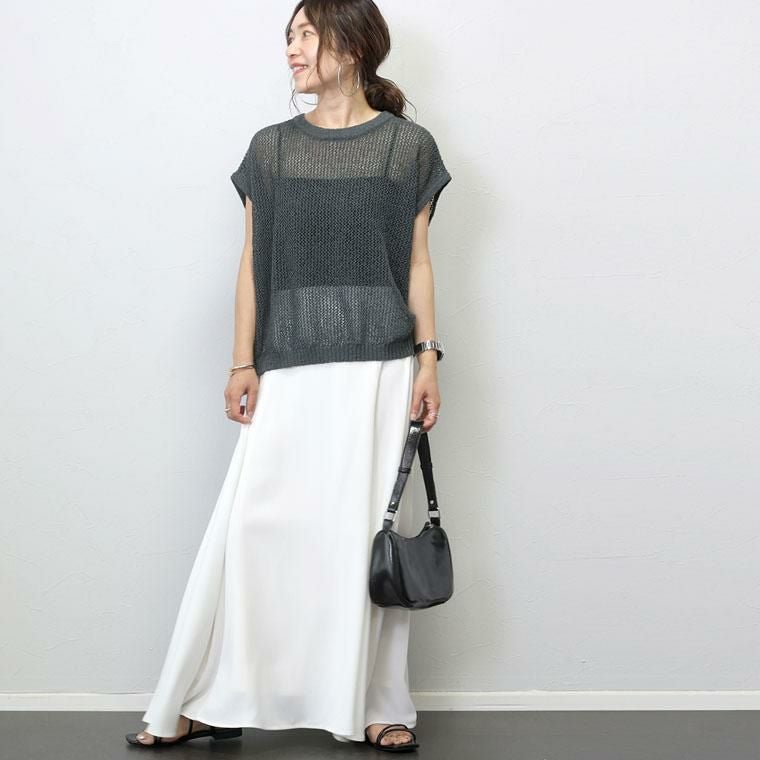 今季マストのメッシュを大人に似合う仕様に仕上げたサマーニットの登場です。程よく細かい立体編み、さらに糸によりを加えることで品の良い透け感に。大人の夏コーデにぴったりな雰囲気に仕上げています。さらりとしたポリニットで肌当たりのストレスなし、自宅でお手入れ可能なイージーケアも嬉しい魅力です。シンプルなデザインで着まわし力抜群ながら、抜け感を生むゆとりあるシルエットやすっきり見せ&涼しさをキープする袖丈、ボトムにストンと重ねるだけでサマになる着丈など大人にとって着やすいポイントを凝縮しました。優しい色展開で上品かつ女性らしい着こなしを楽しめる、夏におすすめの一着です。