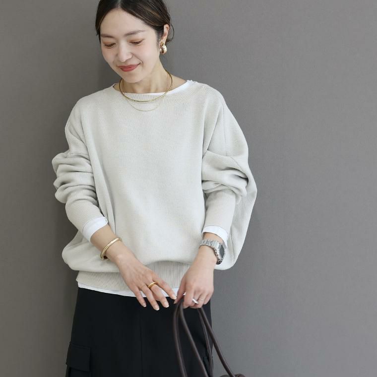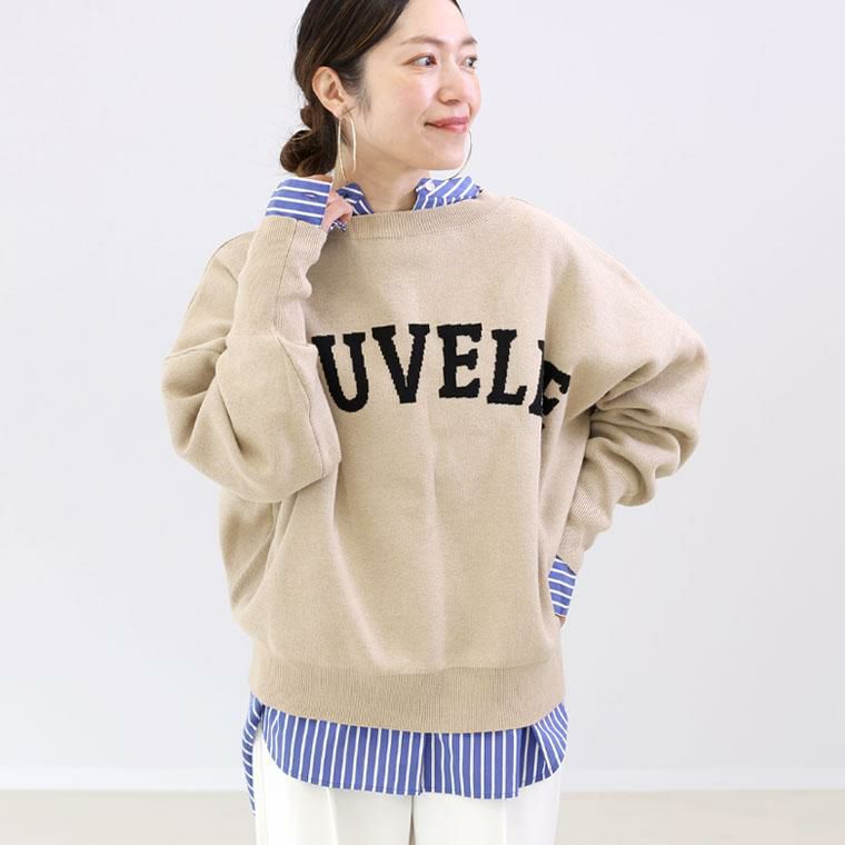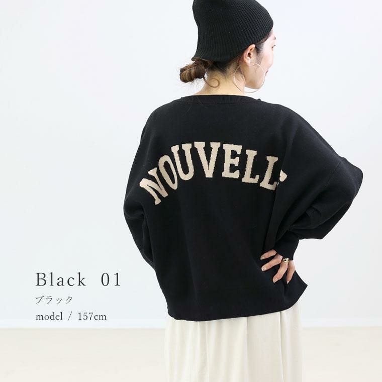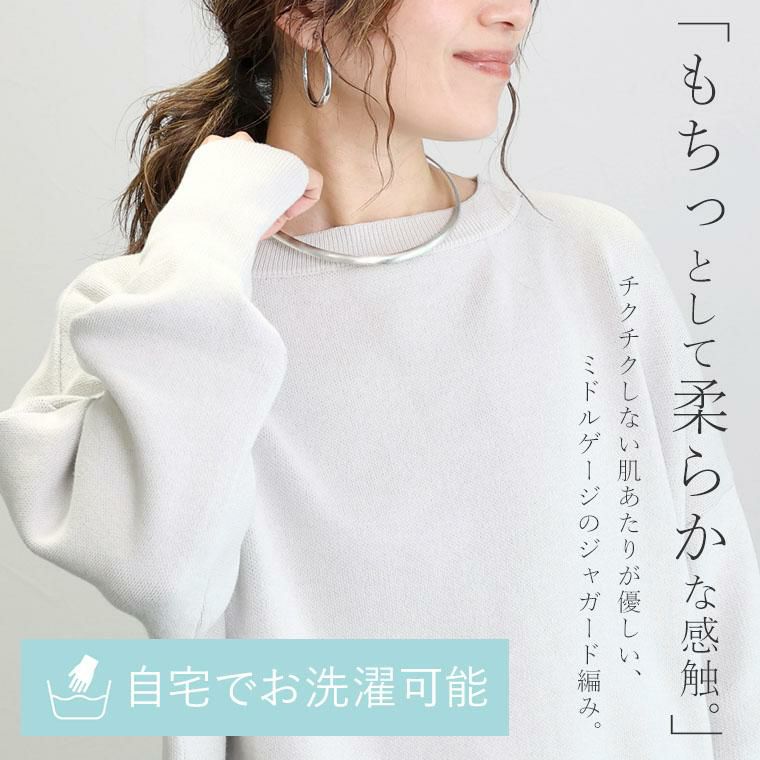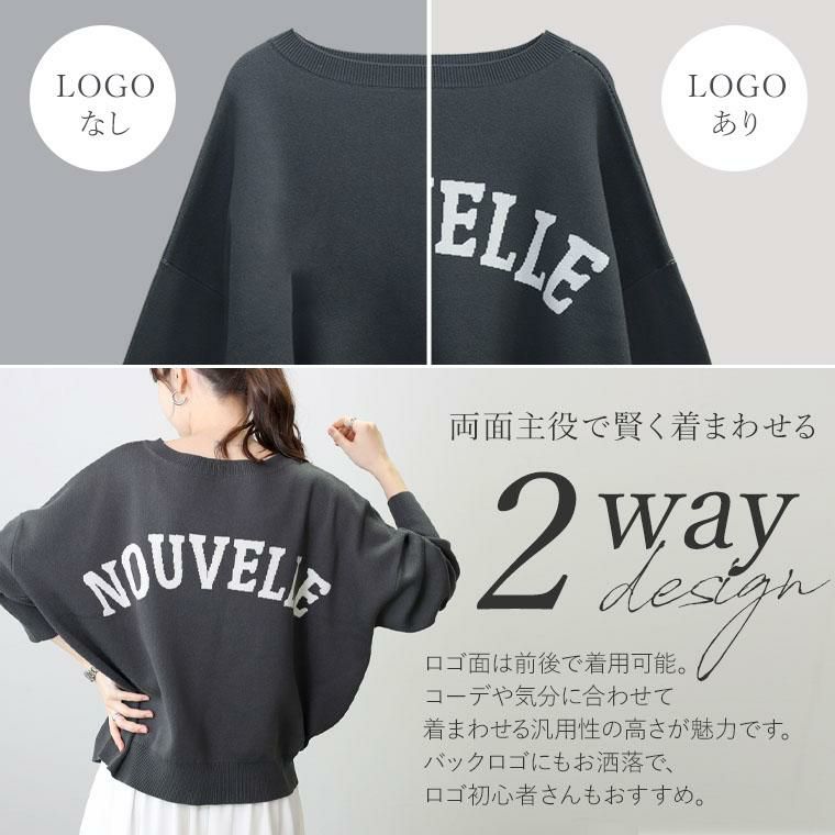 ミドルゲージのジャガード編みにカジュアルなロゴをあしらった、大人の女性が似合うデティールにこだわった秋冬ニット。たっぷり身幅を持たせたドルマンシルエットとボートネックの掛け合わせが絶妙。見ためはすっきり、着心地はゆったりのシルエットを実現しました。ロゴはフロントにもバックにもできる前後2WAY仕様。長めの袖リブがアクセントなり、ストレッチが効いているので腕まくりもしやすいです。頑張らなくてもおしゃれに見えるこなれ感たっぷりのトップスです。