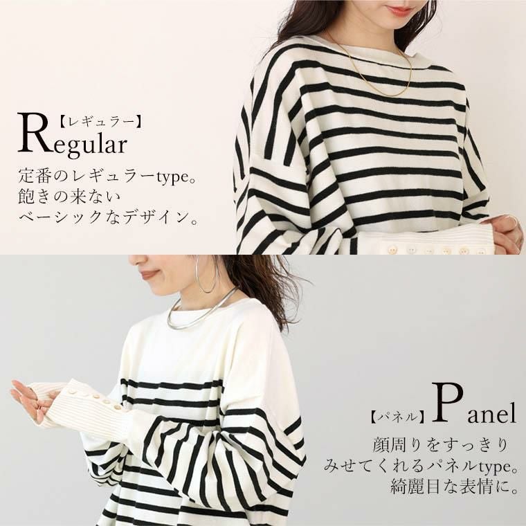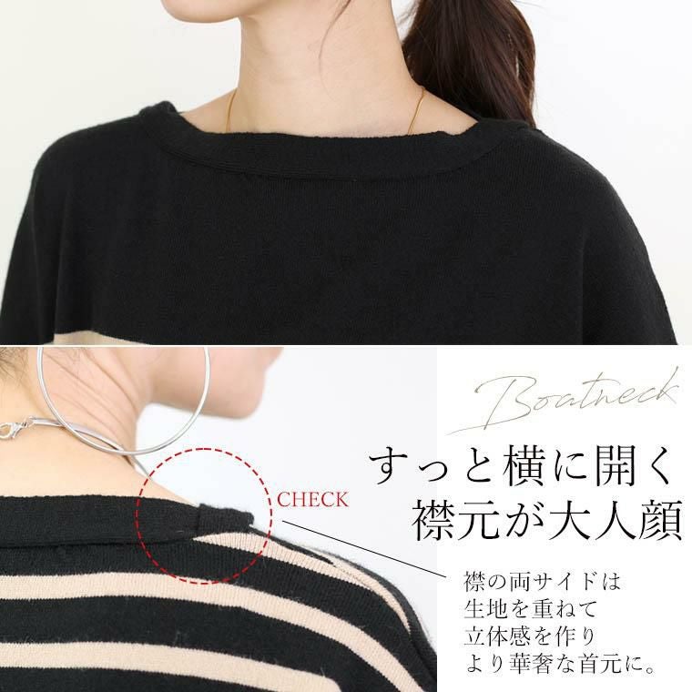 肌触りにもデザインにもこだわったオリジナルニットのボーダーバージョン。ボーダー幅と色合いが絶妙バランスな大人が着やすいレギュラーボーダーとパネルボーダーの2種類をご用意。好みに合わせて選ぶことができ、カジュアルなスタイルはもちろん、きれいめにもマッチする大人デザインです。伸縮素材を編み込む独特の製法で編み上げたストレッチ性抜群のニットで着心地リラクシング。さらに、風合い・保温性・発色性も豊かでお洗濯後の形態変化が少なく素材の良さをキープできる魅力満載の素材です。華奢みせボートネック×腰回りをしっかりカバーするコクーンシルエットの大人の女性に人気のディテールを凝縮。安心感のあるシルエットでボトムも選びません。旬のレイヤードスタイルにも頼れる、着心地快適なストレッチニットです。