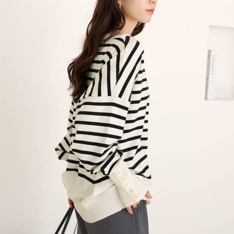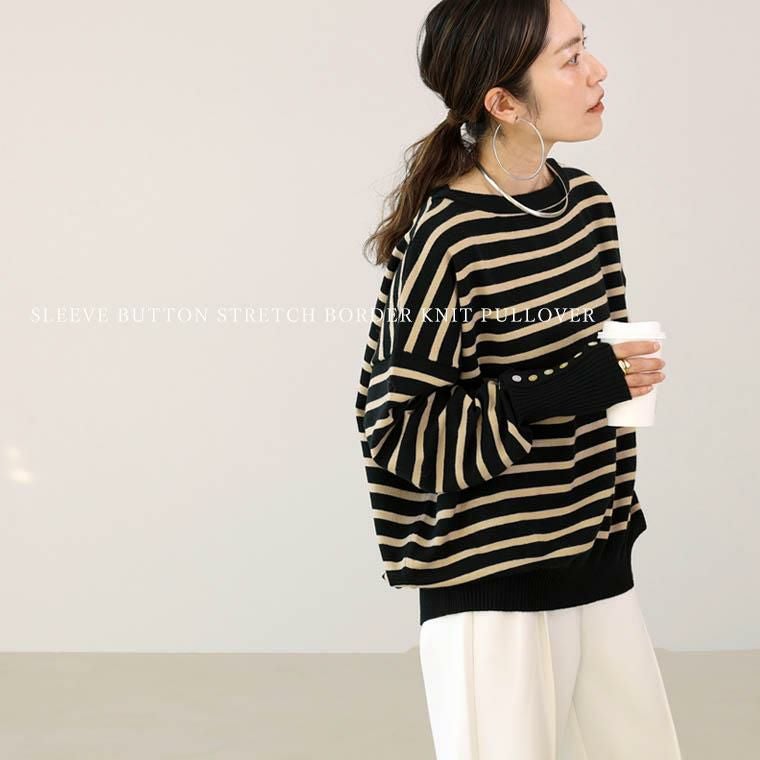 袖ボタンやわらかストレッチボーダーニットプルオーバー