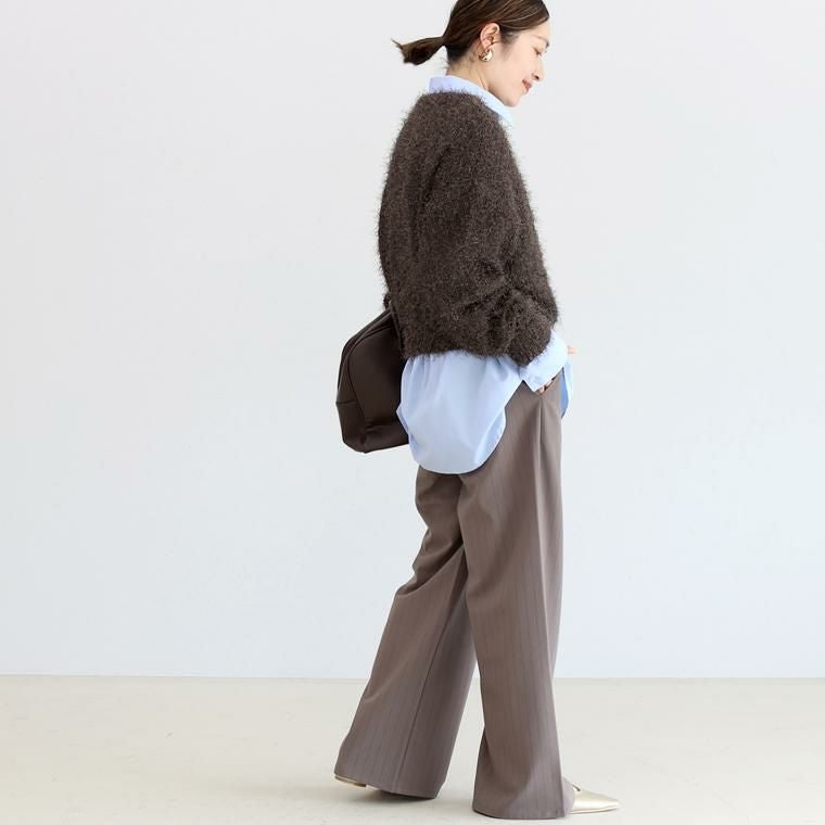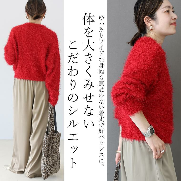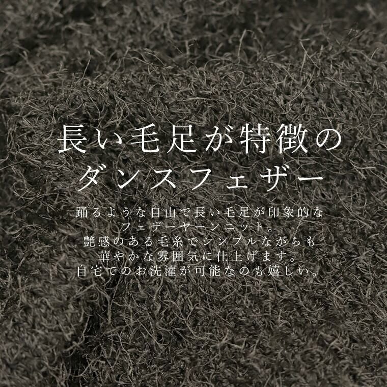 踊るような自由な長い毛足が特徴のダンスフェザーで仕立てたニットプルオーバー。伸縮性に優れた軽い着心地でストレスフリー。表面変化のある素材を生かしたシンプルなシルエットで使い勝手抜群。艶感のある毛糸と綺麗な発色で華やかな雰囲気に仕上がります。ゆったりとしたワイドな身幅と無駄のない着丈が好バランス。人気のドルマンシルエットで一枚ではもちろん、インに重ねるアイテムも選びません。襟元はクルーネックで上品な印象。暗くなりがちな秋冬コーデを華やかに彩る主役ニットです。