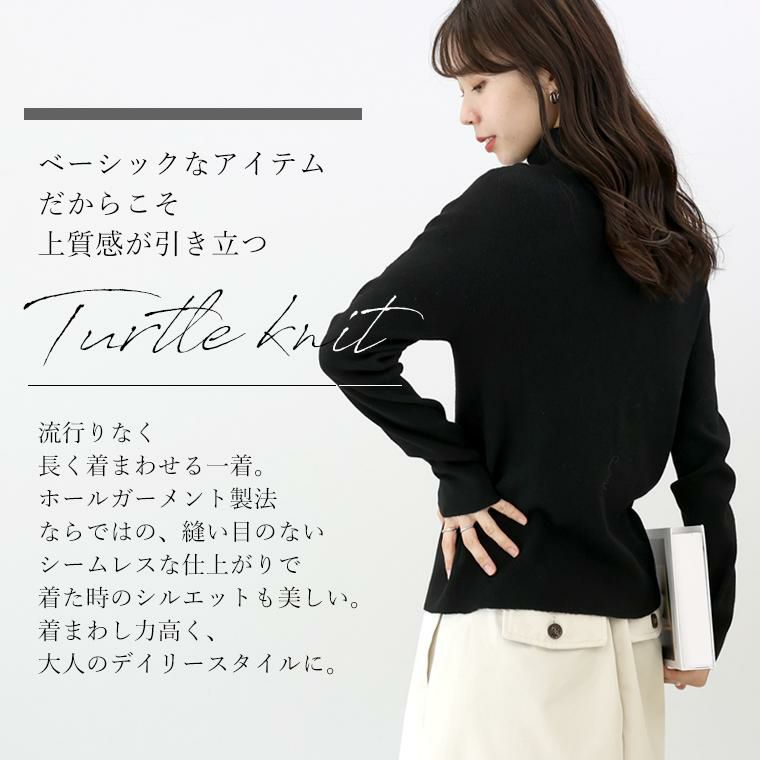 ベーシックなアイテムだからこそ上質感が引き立つタートルニットプルオーバー。ホールガーメント製法ならではの縫い目のないシームレスな仕上がりで、ごわつきなく快適な着心地。ポリエステル×ナイロンの糸を編み込んだ生地で、柔らかくなめらかな風合い。伸縮性にも優れ、ノンストレスな着心地をお届けします。ほどよくゆとりを残した無駄のないシルエットで、一枚でも重ね着でも美バランス。どんなコーデにも合わせやすく、長く活躍してくれます。さらにタートルネックが首元を包み込み、上品さと暖かさを両立。品よく、心地よく、冬を味方にする着るたびに整う大人の為のニットです。
