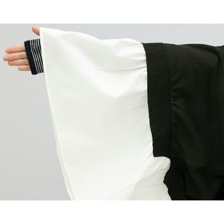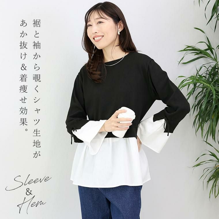 裾と袖から覗くシャツ生地があか抜け&着痩せ効果。身生地は軽いポリハイゲージニットで優しい風合いながら肌触りはさらりとしていて上質な印象です。襟元は自然に波打つクルーネック。女性らしい柔らかさを演出します。キャンディースリーブと袖口の共布リボンが手元に華やぎを添えます。ウエストは切替ゴムでメリハリをつくり、ラクな着心地。たっぷりギャザーのペプラムが腰回りを上手にカバー。裾のシャツ生地が気になる腰回りをカバーしながら脚長・スタイルアップ効果。通勤にも週末にも使える上品デザイン。気になるところはふんわり隠しながら、『綺麗』が纏える1着です。
