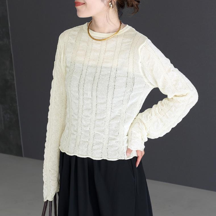 シュリンク感あるシボが、奥深さを演出するシアーニット。天竺×立体編みストライプが単色ながら表情豊かな印象です。ほどよい透け感が軽やかさを醸し出し、季節の変わり目にぴったりです。手元をすらりと見せるロングスリーブがスタイルのアクセントに。着丈はジャストな丈で着ぶくれ感を払拭、バランス良いシルエットです。袖口と裾のカール仕様で、さりげなく女性らしさをプラス。くしゅっとしたシルエットが愛らしいニットプルオーバーです。