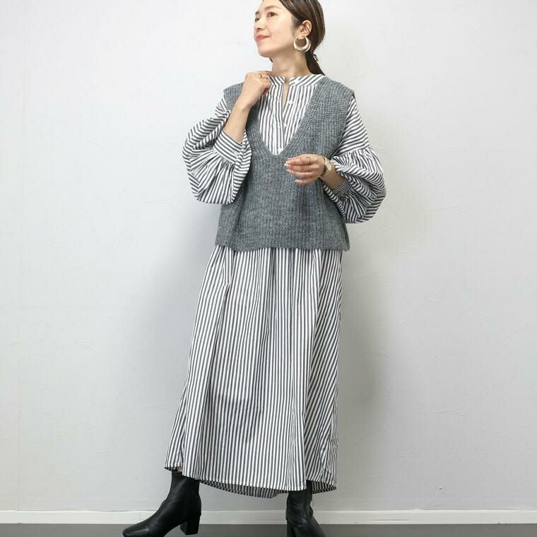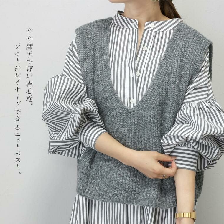長すぎない着丈がトレンドライクなニットベスト。メランジ糸を使用することで、濃淡のある表情豊かな印象に。深めのVネックなので、全身をすっきり見せてバランスの良いスタイルに仕上げます。身幅と脇繰りはゆったりしているから、ボリューム袖アイテムと合わせてもサマ見え。お手持ちアイテムに重ねるだけで、旬めくアイテムです。