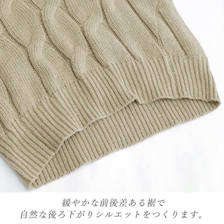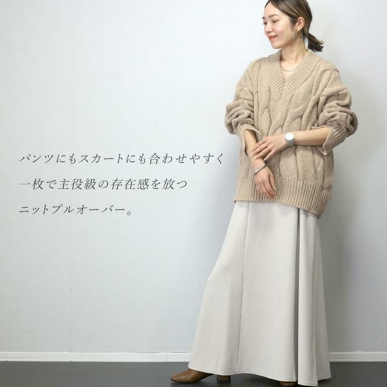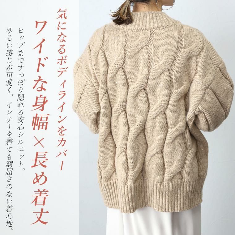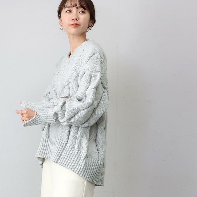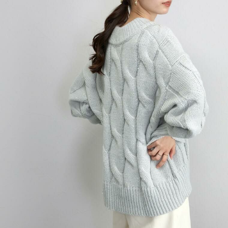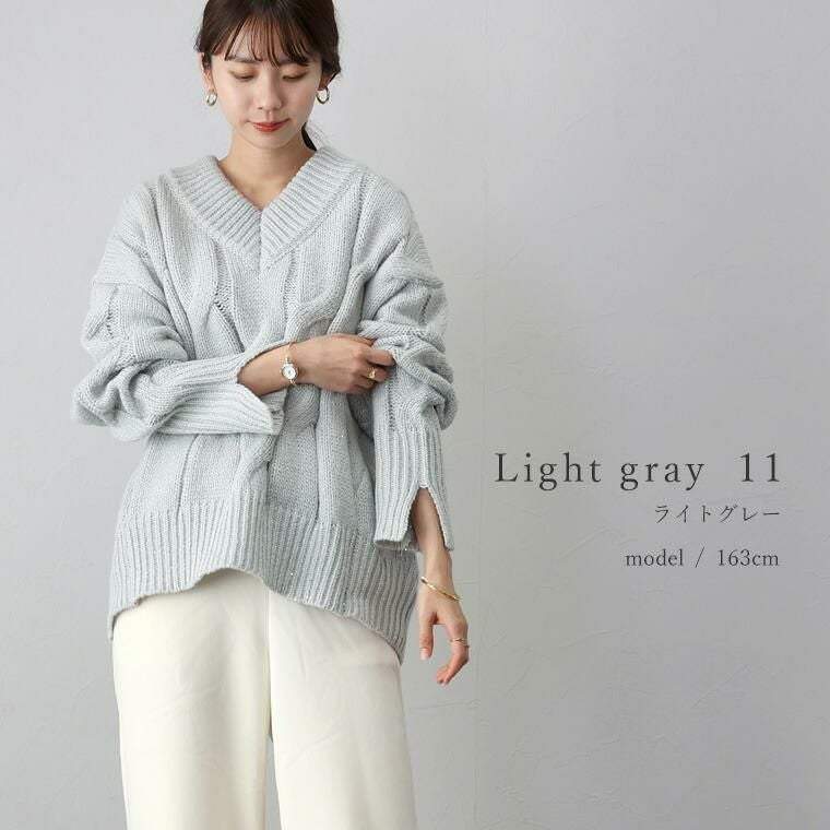 スリット糸ケーブル編みVネックプルオーバー 全体に散りばめられたスパンコールがエレガント、 トレンドムードを高めるニットプルオーバー。 素材は厚みのある3Gニットを採用。大柄のケーブル編みと 煌めくラメ感が華やかさを演出して一枚できちんと着映えます。 ワイドなシルエットとシャープなVネックが、女性らしい抜け感ある印象。 長めの袖リブにはスリットが施されて手元を華奢に見せます。 着丈は長めの安心デザイン、ゆるいシルエットが魅力のニットアイテムです。