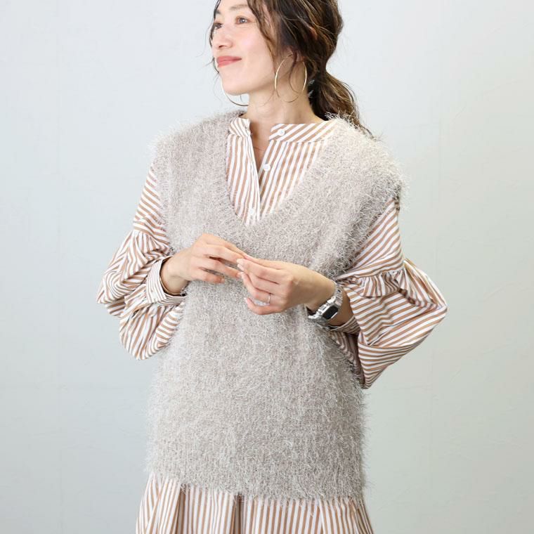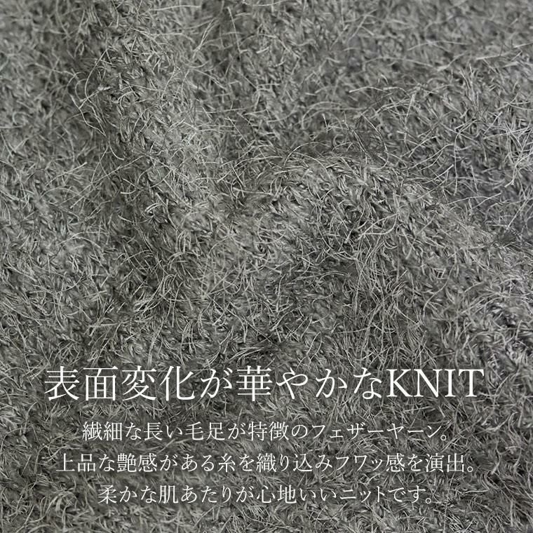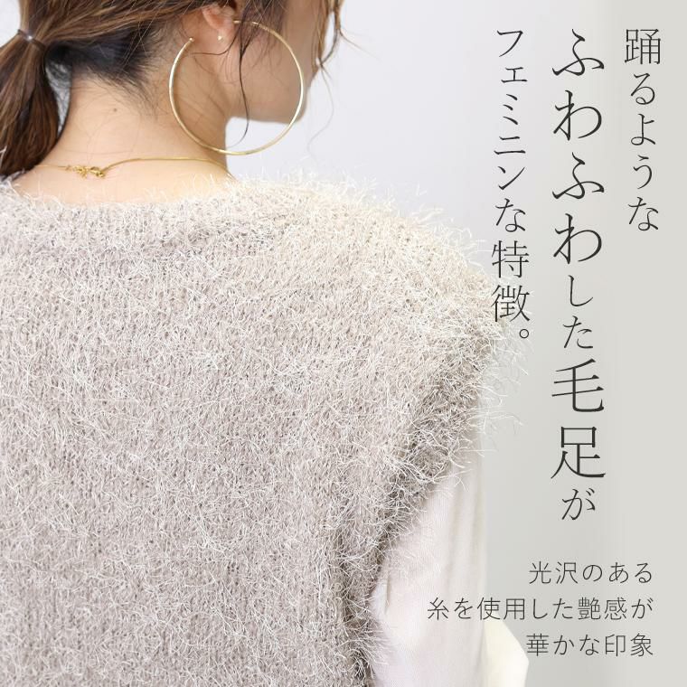 踊るような長い毛足が特徴のフェザーヤーン仕立て。表面変化ある艶感糸を織り込み華やかな印象です。柔かな肌あたりで素肌で着てもチクチク感がないのも嬉しいポイント。大きく開いたVネックはデコルテをきれいに見せるとともに、シルエット全体もすっきり見せてくれます。ほどよくゆとりある身幅と脇繰りで旬のボリューム袖とも合わせやすく、シアーインナーやハイネック、Tシャツ、タンク等、アイテム次第で長いシーズンを通してレイヤードできます。