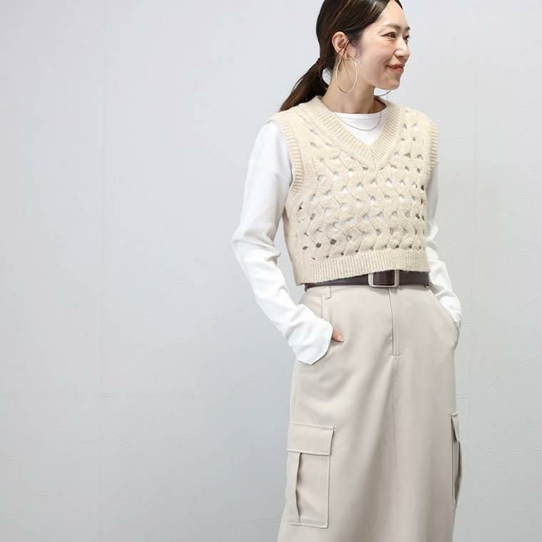 曲線を描く透かし編みが特徴のニットベスト。カットソーはもちろん、ワンピースや長めのシャツと合わせれば今年らしいスタイリングを楽しめます。やや短めの着丈で、上半身をコンパクトに見せスタイルアップ効果もあります。さらにVネックで顔回りもすっきり。合わせるアイテムで表情を変えられます。ニットはほんのり起毛感のある杢調カラーで立体感ある風合い。軽い着心地で秋から春まで長い季節着まわせるアイテムです。