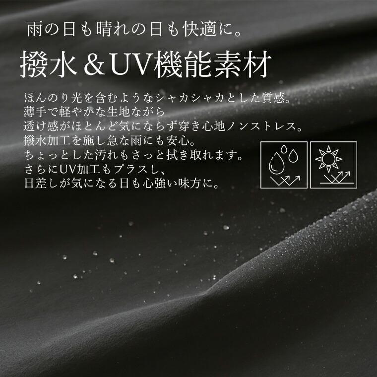 憂鬱になりがちな雨の季節すら待ち遠しくなる、そんな気持ちを込めて仕立てた、機能性と美しさを兼ね備えた梅雨待ちスカート。撥水&UV加工を施し、天候に左右されずお洒落を楽しめます。撥水加工には非フッ素素材を使用し、環境へのやさしさにもきちんと向き合いました。急な雨やちょっとした汚れもさっと拭き取ることができ、楽々ケア。日差しの気になる日も心強いUVカット素材で、穿くだけで簡単に紫外線対策してくれます。生地を贅沢にたっぷり使いながらも、広がり過ぎず上品に揺れるフレアシルエット。着膨れせず、むしろ縦ラインを強調させる切替位置に設定し、大人に似合う美しいすらり感を演出しました。ベーシックなカラー展開と、着丈を選べる2サイズをご用意し、お好みや体型で選べます。大人の女性にこそ届けたい、頼れる華やかスカートです。
