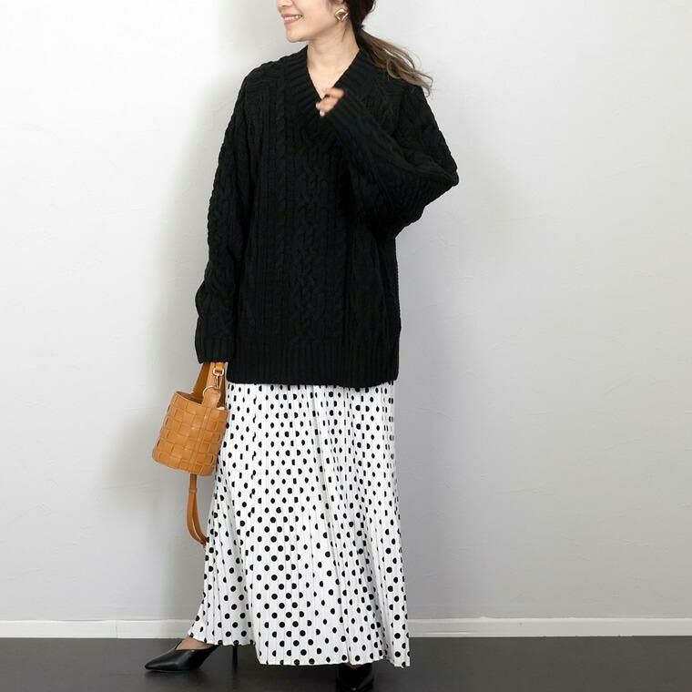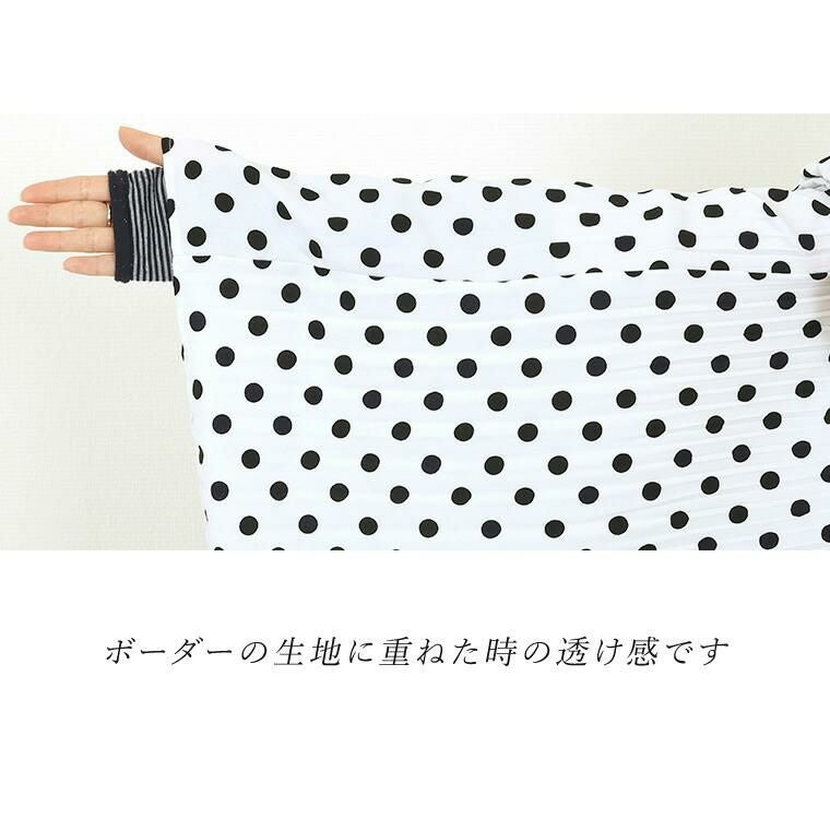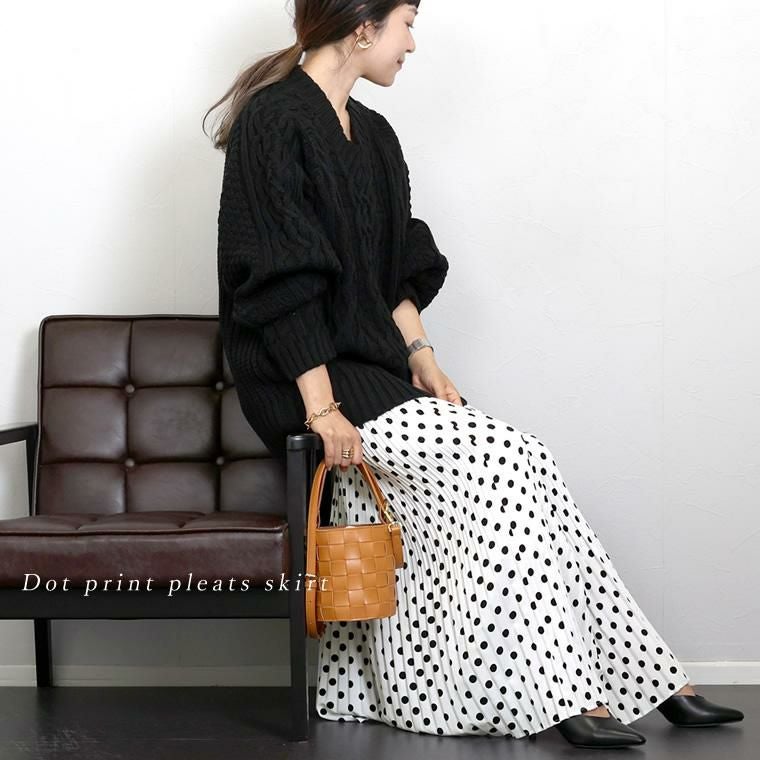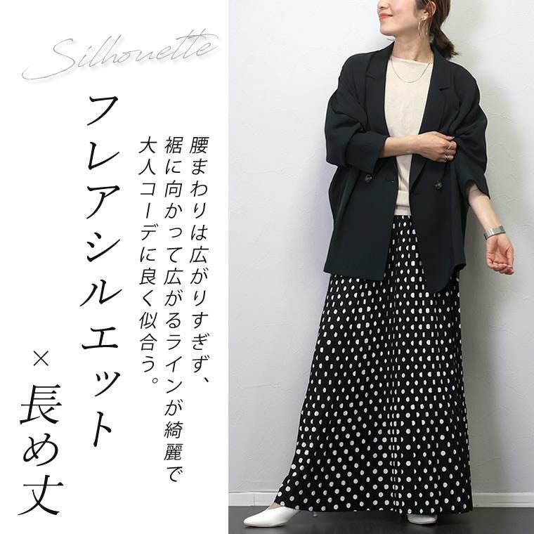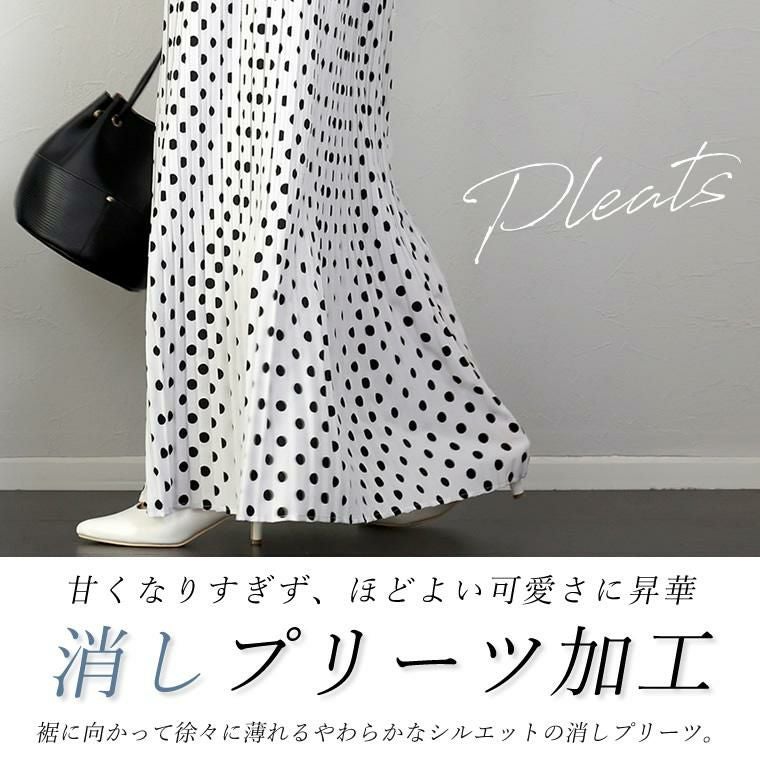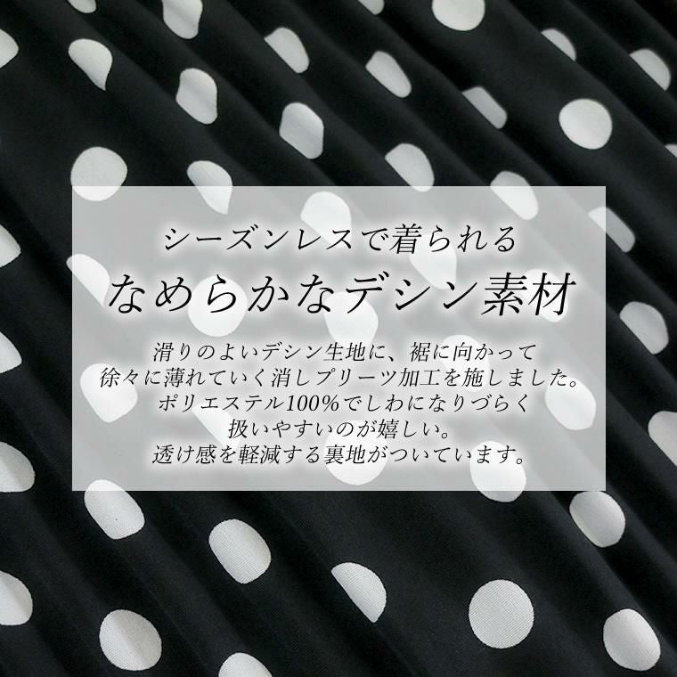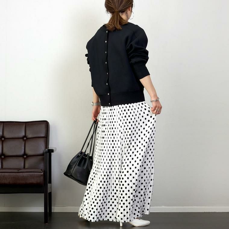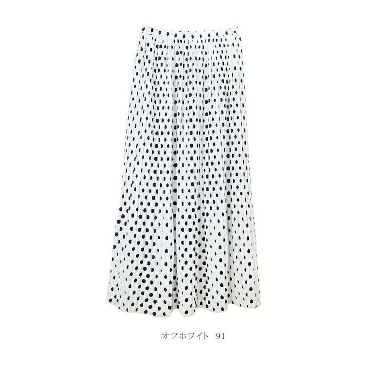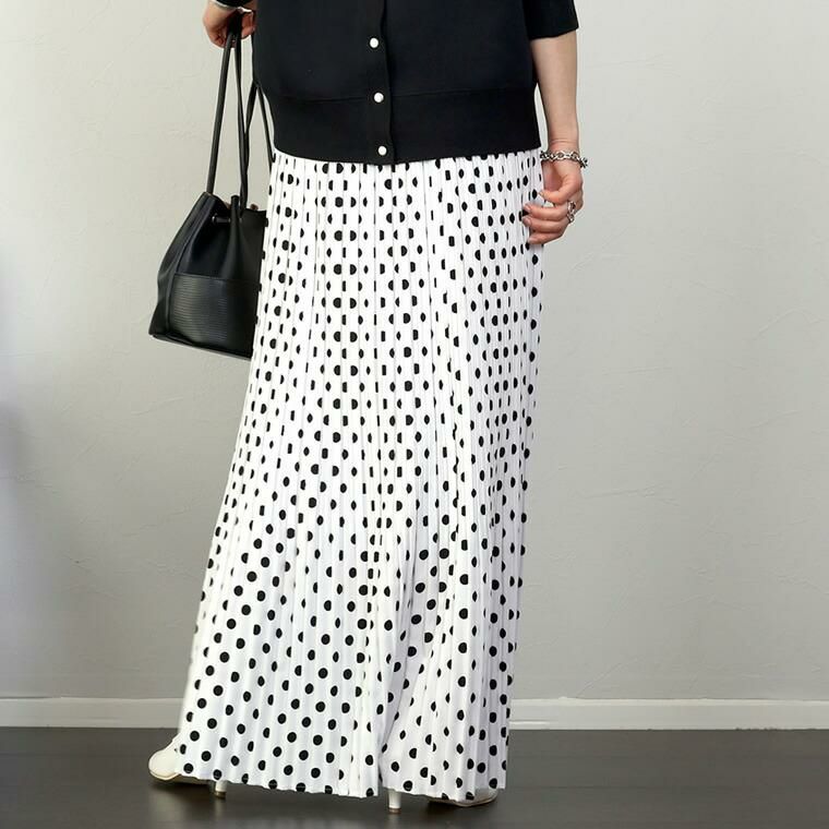 ドットプリント消しプリーツスカート 当店定番の消しプリーツスカートに新柄が登場。 主役級の華やぎをみせる、目を惹くドットプリントが新鮮。 甘くなりがちなドット柄も、シックなモノトーンなので大人に似合う ほどよい可愛さに昇華。コーデに取り入れやすいのも嬉しいポイントです。 シルエットは、腰回りは広がり過ぎず裾に向かって優しく広がるフレア。 陰影のある消しプリーツが歩く度に軽やかに揺れ、女性らしさを ぐっと高めてくれます。シーズンレスで使えるデシン生地を使用し、 季節に合わせて様々なスタイリングが楽しめます。 ▼ 当店定番 消しプリーツスカートシリーズ ▼