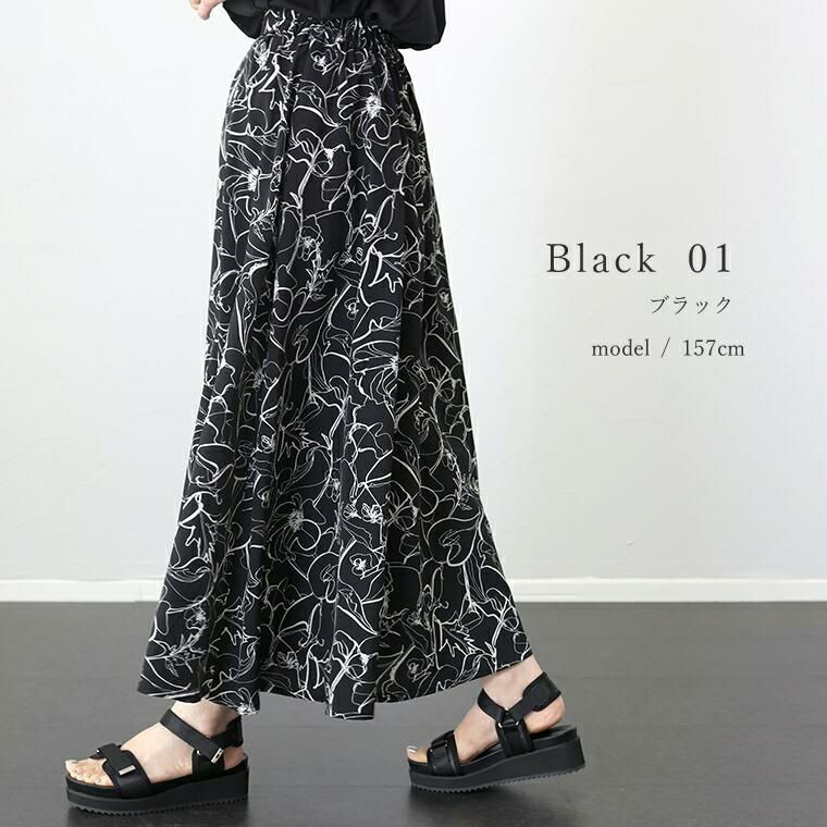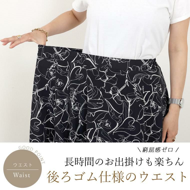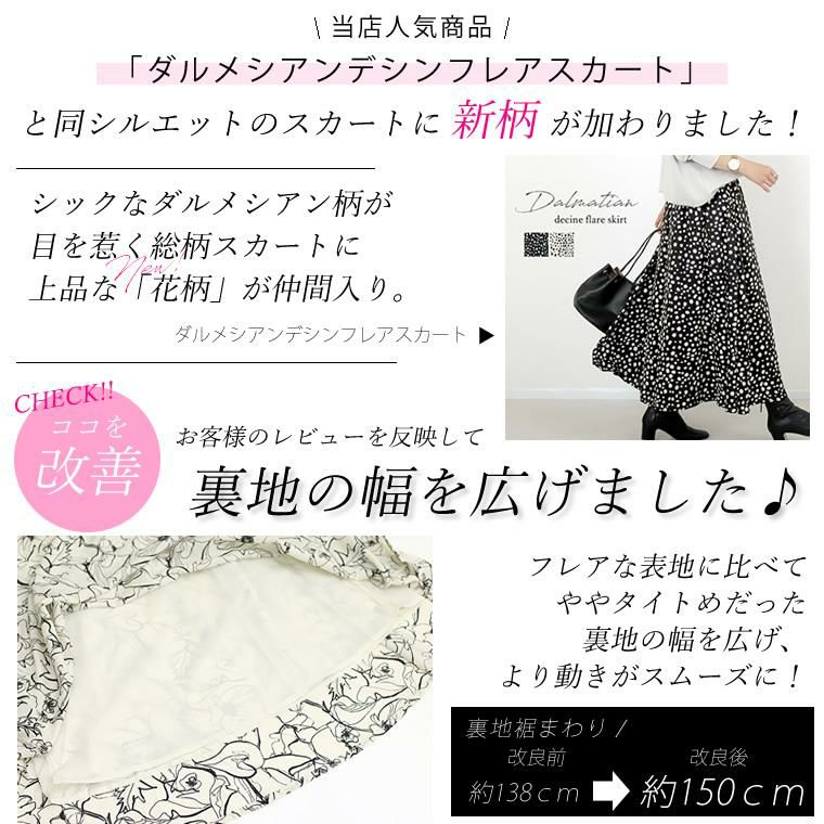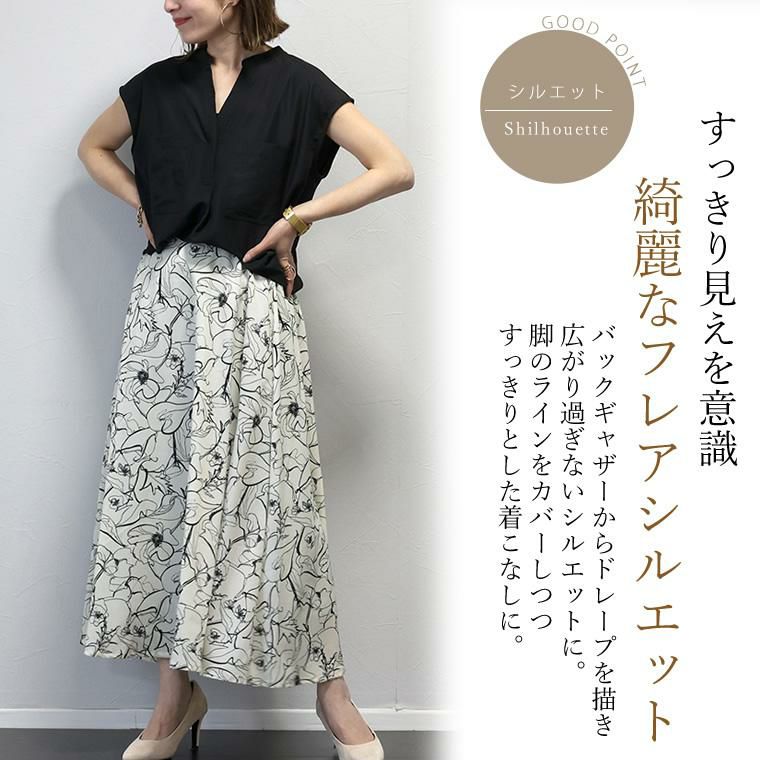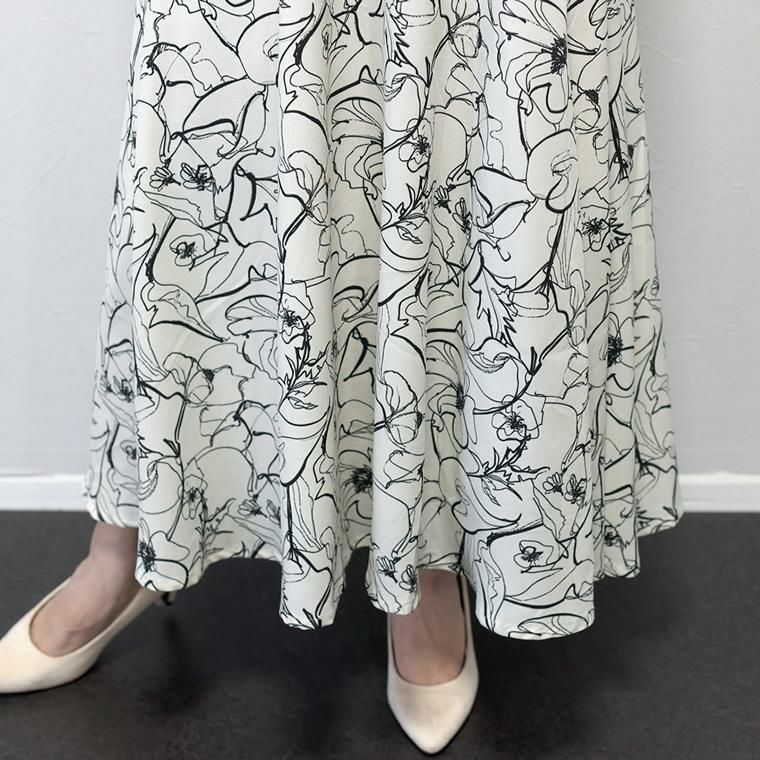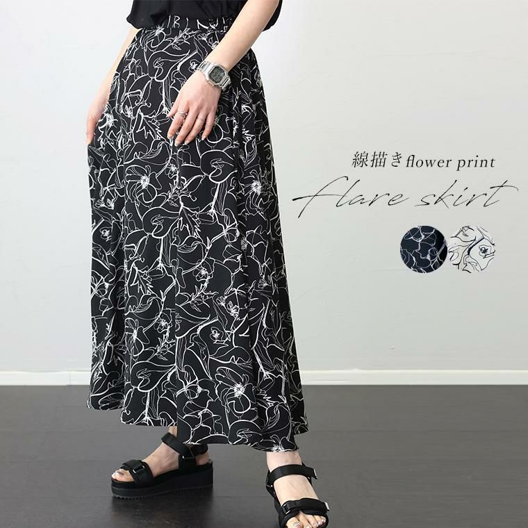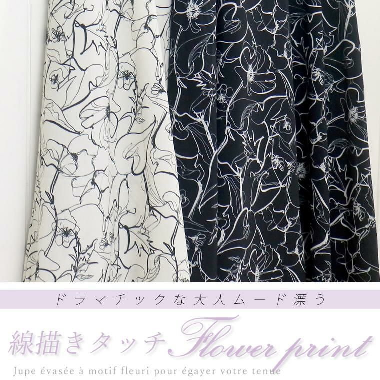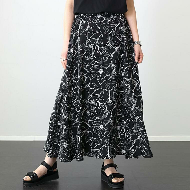線描き花柄プリントフレアスカート 当店定番「ダルメシアンデシンフレアスカート」のシルエットに新柄が仲間入り。 ドラマチックな大人なムード漂う線描きフラワーの総柄スカートです。 モノトーンなのでコーデにも取り入れやすく、上品なスタイリングに。 柄もの初心者さんにもおすすめです。シルエットは人気の広がりすぎない フレアで、脚のラインをカバーしながらすっきり見えを意識。後ろウエストゴムの 自然に生み出すドレープ感で優美なシルエットを描きます。シーズンレスで 着られる生地で、季節に合わせた着こなしを楽しんでいただけます。