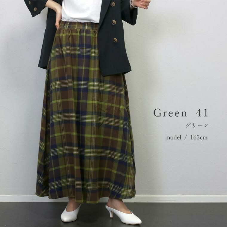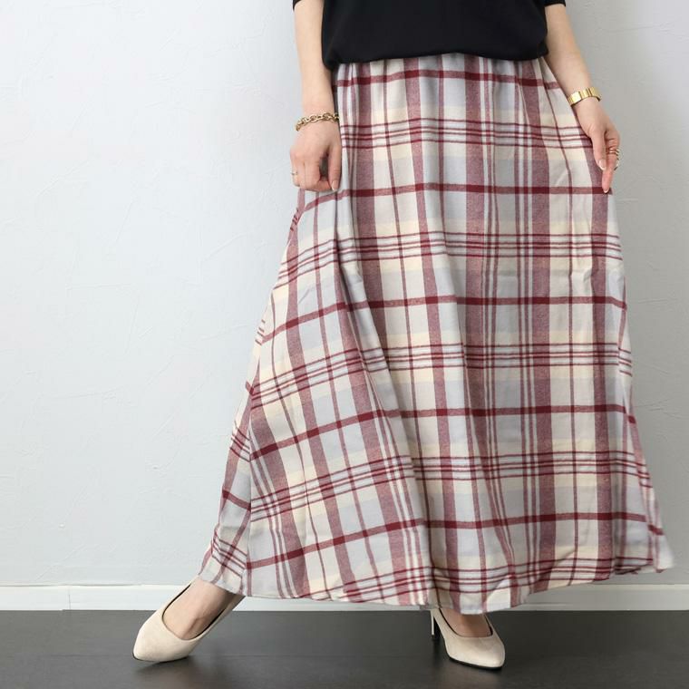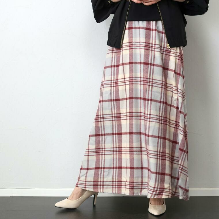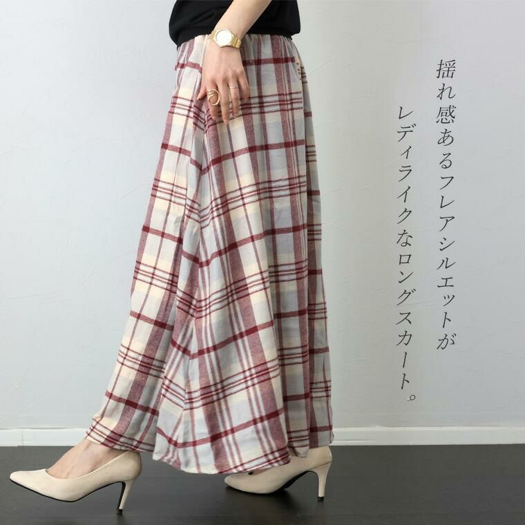 T/Rチェックフレアロングスカート ふわりと広がるAラインシルエットが印象的なチェック柄スカート。 柔らかくて薄手の微起毛ビエラ生地を採用し、ライトな穿き心地。 こだわりの配色チェック柄は大人コーデと馴染みやすく 華やかさもあるカラーリングです。 落ち感ある生地は広がりすぎず、すらりとしたシルエットを演出。 フレアシルエットが体のラインカモフラージュしてくれ体型カバー力も抜群です。 着映えもきちんとある大人カジュアルなロングスカートです。