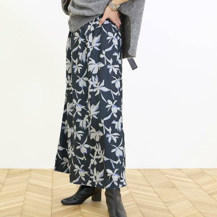 単調になりがちな秋冬コーデを華やかにクラスアップしてくれる柄スカート。上品な雰囲気を醸し出すフラワープリントがコーディネートのほどよいアクセントに。甘くなり過ぎない落ち着いた柄使いで大人コーデに取り入れやすいのも魅力です。生地はすべりのよいビンテージサテン。やさしい光沢感が女性らしい印象を与える。薄手で軽く、インナーを変えて通年活躍する生地感です。腰回りはすっきり、裾に向かって広がるマーメイドシルエットと生地の落ち感ですらり美人シルエットを完成。シンプルなトップスに合わせるだけでおしゃれなコーデに仕上がる主役スカートです。