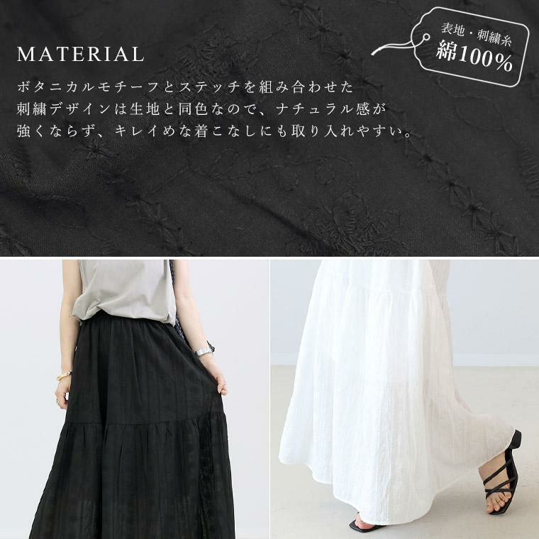 ボタニカルモチーフとステッチを組み合わせた刺繍デザインは生地と同色なので、ナチュラル感が強くならずキレイめな着こなしにも取り入れやすい。切替にたっぷりとギャザーを寄せたティアードシルエット。華やかさと体型カバーの両方が叶います。ウエストは全周ゴム仕様で着脱簡単、穿き心地も楽です。膝位置まで裏地がついています。足元の透け感が軽やかさと抜け感を誘います。きちんと感のあるアイテムを合わせたコーディネートもおススメです。