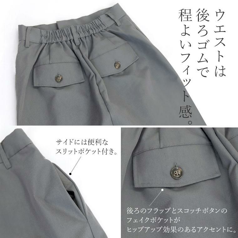 着丈はくるぶしくらい。ウエストは後ろゴムですが私は少し大きく感じました。脚幅は窮屈感なくラインもカバーしてくれて◎。硬めの生地ですが広がりもあり脚捌きは良いです。