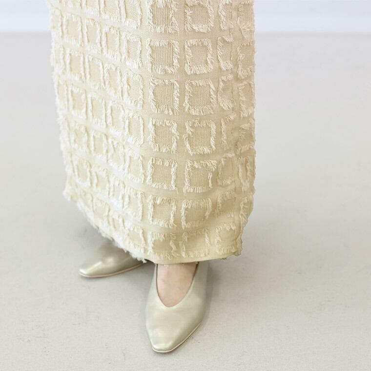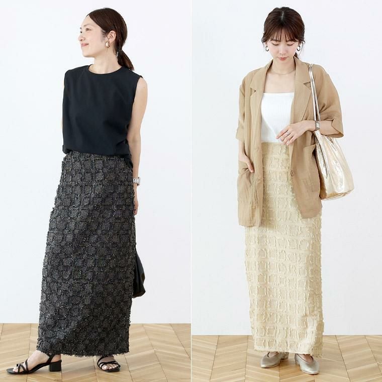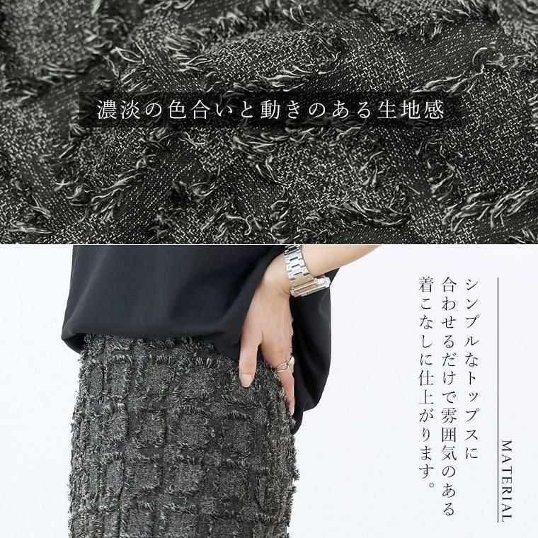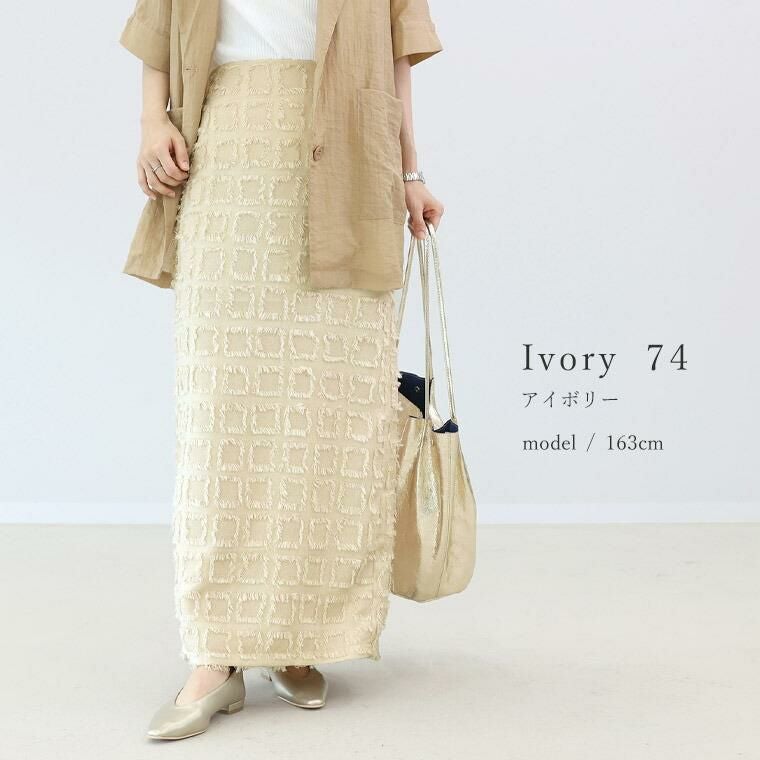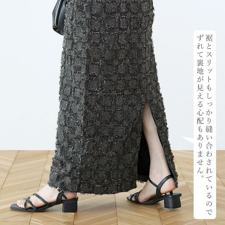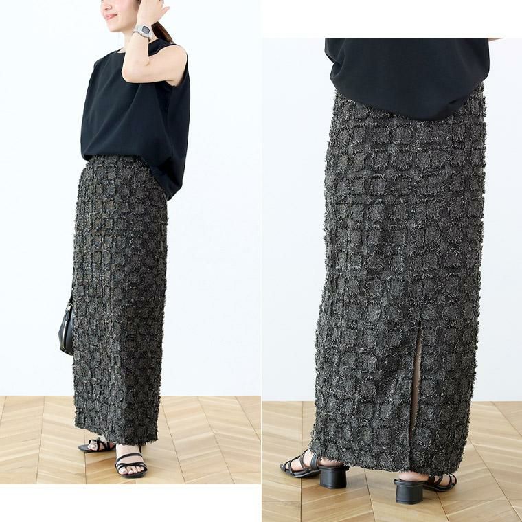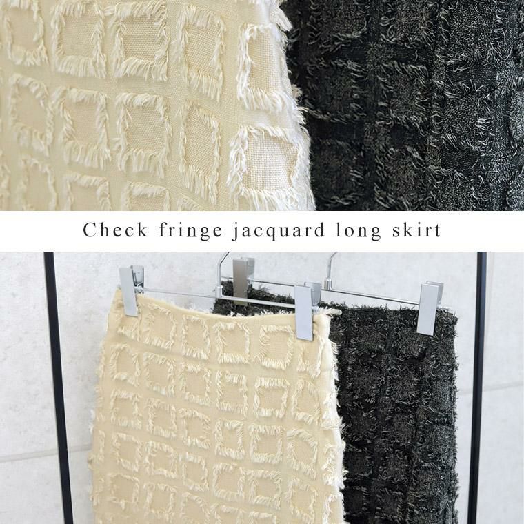 【表面変化のあるフリンジチェックロングスカート】