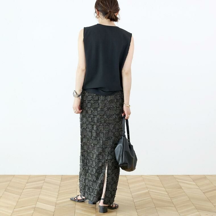 濃淡の色合いと動きのある生地感で、シンプルなトップスに合わせるだけで雰囲気のある着こなしに仕上がります。すらりとしたIラインシルエットに切替の無いウエスト仕様で脚長効果が抜群です。サイドのコンシールファスナー仕様。ウエストは後ろゴムで楽な穿き心地。スリットで足さばきの良さもしっかり確保。総裏付で透け感を気にせず着用できます。裾とスリットもしっかり縫い合わされているのでずれて裏地が見える心配もありません。