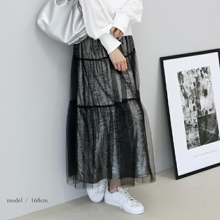 新作72H限定クーポン利用で10%OFF★4月1日10時発売開始★メタリックxチュール重ねロングスカート 【メール便不可】