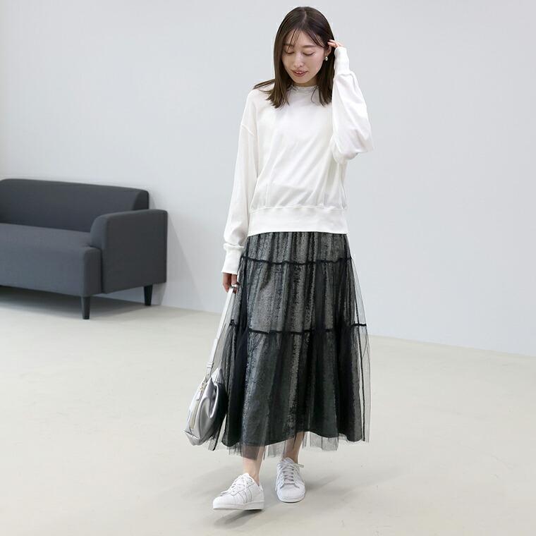 クラッシュシルバーの輝きに、ブラックチュールの軽やかな揺れ。甘さとモード感を程よくミックスした、大人のための華やぎスカート。陰影のあるクラッシュシルバーの薄手のメタリック生地に、ブラックチュールをティアードでレイヤード。ロング丈+フレアシルエットで気になる腰回りや脚のラインをふんわりカバー。歩くたび揺れるシルエットが女性らしさを引き立てます。裾のチュールから足元がほんのり透けて、シックなカラーでも重たく見えず軽やかな印象です。ウエストは全周ゴムで締め付け感なく着用いただけます。薄手で軽く、長時間着てもストレスフリー。裏地なしでも透けにくく、気軽に1枚で着用いただけます。シンプルなトップスに合わせるだけで、装いをぐっと洗練された印象に導くアイテムです。