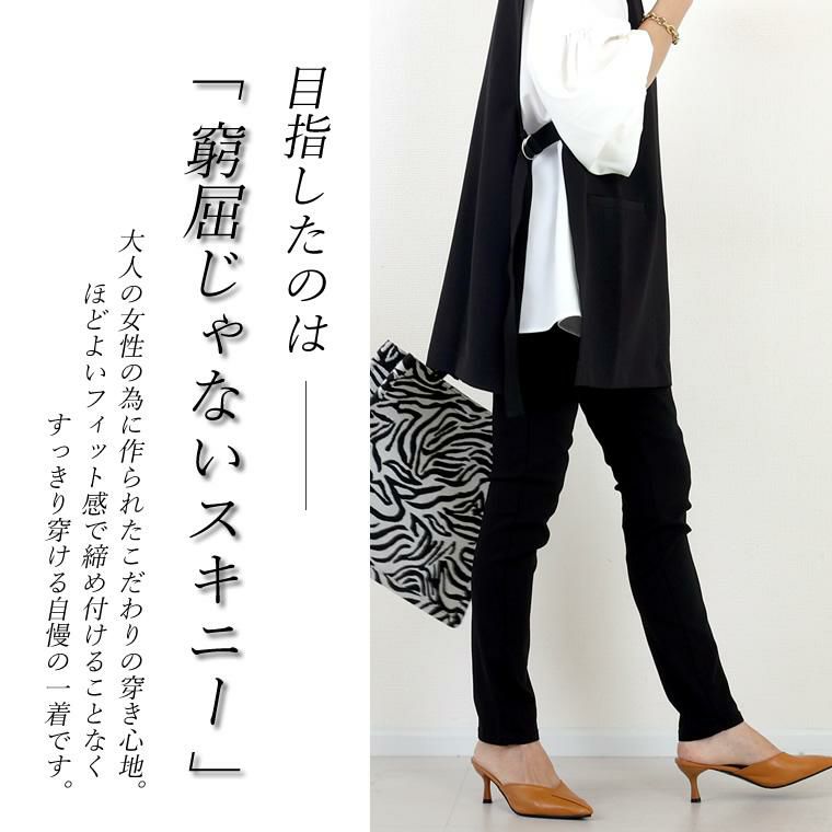 極伸びストレッチスキニーパンツ 抜群のストレッチ力に富んだ大好評の「 極伸び? 」シリーズからスキニータイプの登場。 横にも斜めにもぐ~んと伸びる驚異の伸縮性で、締め付け感を与えずほどよくフィット。 窮屈じゃないスキニーを目指して作られた、とにかく楽!な穿き心地が自慢です。 ウエストは後ろゴムでよりリラクシーに。アクティブなシーンから長時間の デスクワークまでシーン問わず活躍。股上も深めに設定されているので、しゃがんだ時も 安心です。ON・OFF兼用、365日毎日穿ける自慢の美脚パンツを大人のワードローブに。 ※ご注意ください※ こちらの商品はかなりストレッチ性に富んだ生地を採用しておりますため、 重ねて生地を裁断する際にズレが生じ、稀に個体によってサイズにばらつきが出じます。 同じサイズのご購入の場合でも着用感に違いが生じてしまう場合がございます。 改善に努めてまいりますが現状回避しがたい状態でありますため 恐れ入りますが予めご了承くださいますようお願いいたします。 ※弊社基準として、サイズ表より3cm以上の違いがある場合は サイズ不良として承らせていただいております。 お届け商品にお気づきの点がございましたらお手数ですがご連絡をお願いします。 究極の穿き心地「極伸び?」テーパードタイプはこちら!
