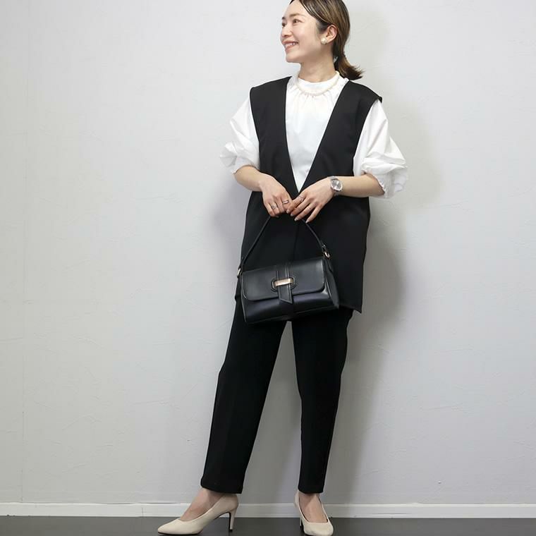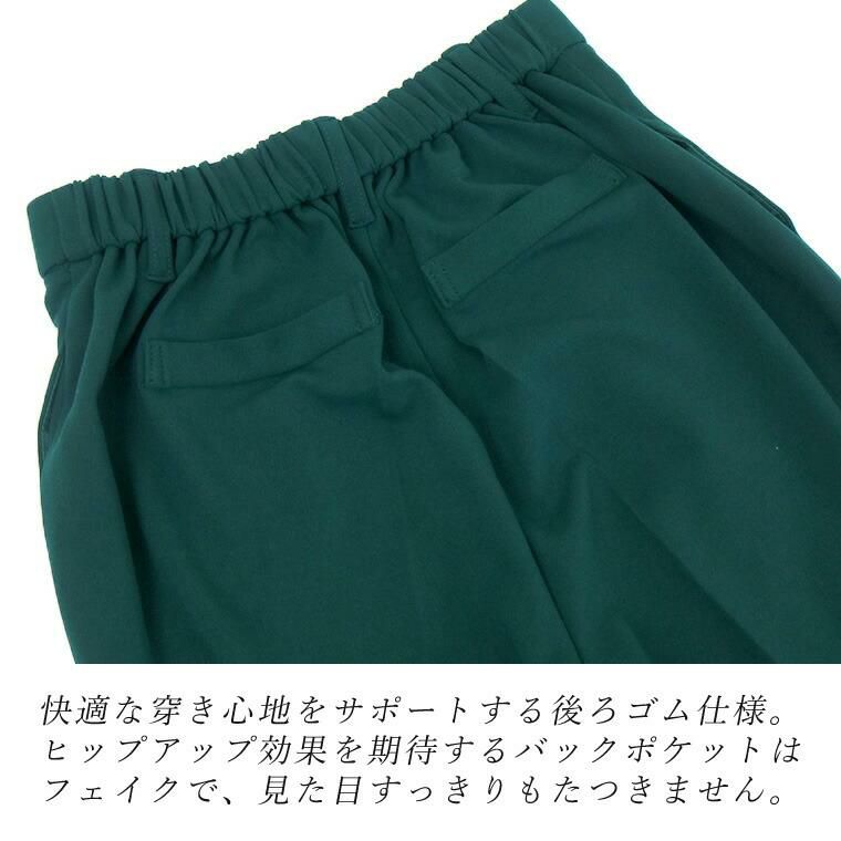 ダブルクロスタックテーパードパンツ 上品なドレープ感と穿きやすさが魅力の通年テーパードパンツ。 インナーが響きづらいほどよい厚みと、落ち感のある品の良いダブルクロス 生地を採用。ソフトな弾力性もあり、動きに合わせて生地が優しく伸縮し 着心地も快適。ウエストの後ろゴム仕様も嬉しいポイントです。 シルエットは腰まわりゆったり、裾に向かってスッとスリムになる美脚見え テーパード。体型カバーにも定評のあるシルエットで、大人の女性におすすめです。 オンオフ問わずオールシーズン着まわせ、デイリーコーデの救世主に。