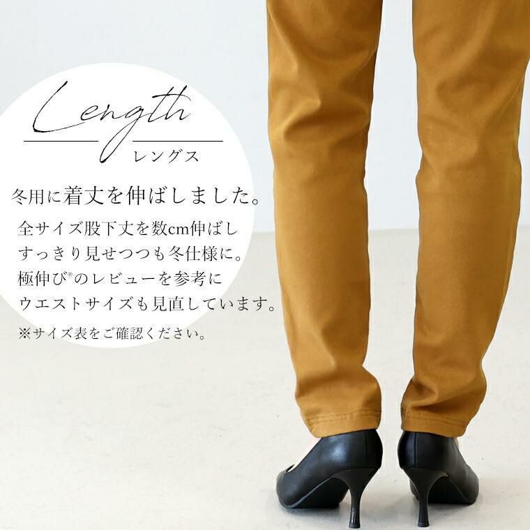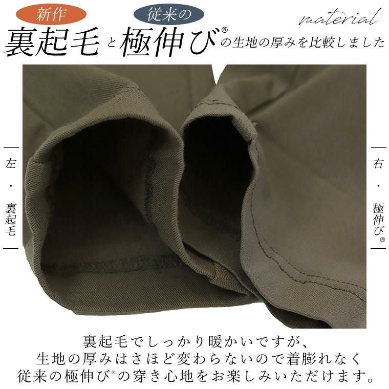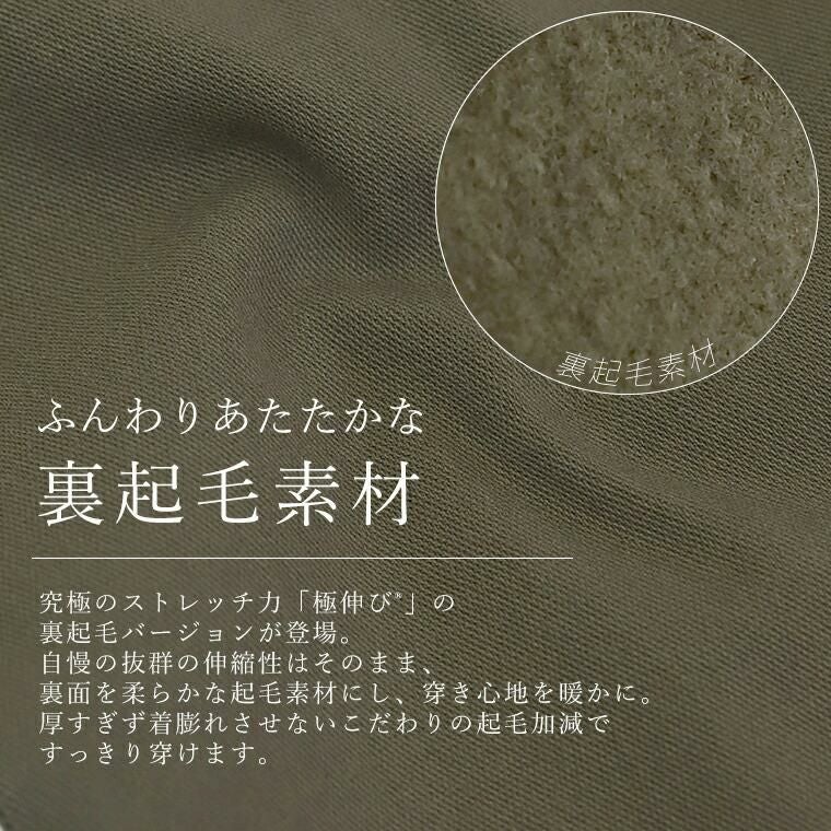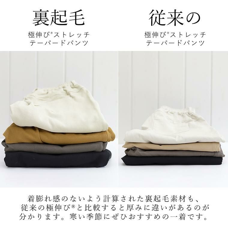 きれい見えするのに楽ちん、驚異のストレッチ力が自慢の極伸びテーパードの裏起毛バージョンが登場です。当店一番人気の「極伸びテーパード」の伸縮性とシルエットはそのまま、あたたかな裏起毛を採用し、さらに冬用に着丈を伸ばしました。レビューを参考にウエストサイズも見直しています。ふんわりあたたかな裏起毛ですが生地の厚みはさほど変わらないので、着膨れなく従来の穿き心地をお楽しみいただけます。寒い季節もやっぱりこれ!すでに極伸びをお持ちの方にはもちろん、はじめましての方にもぜひおすすめしたい一着です。